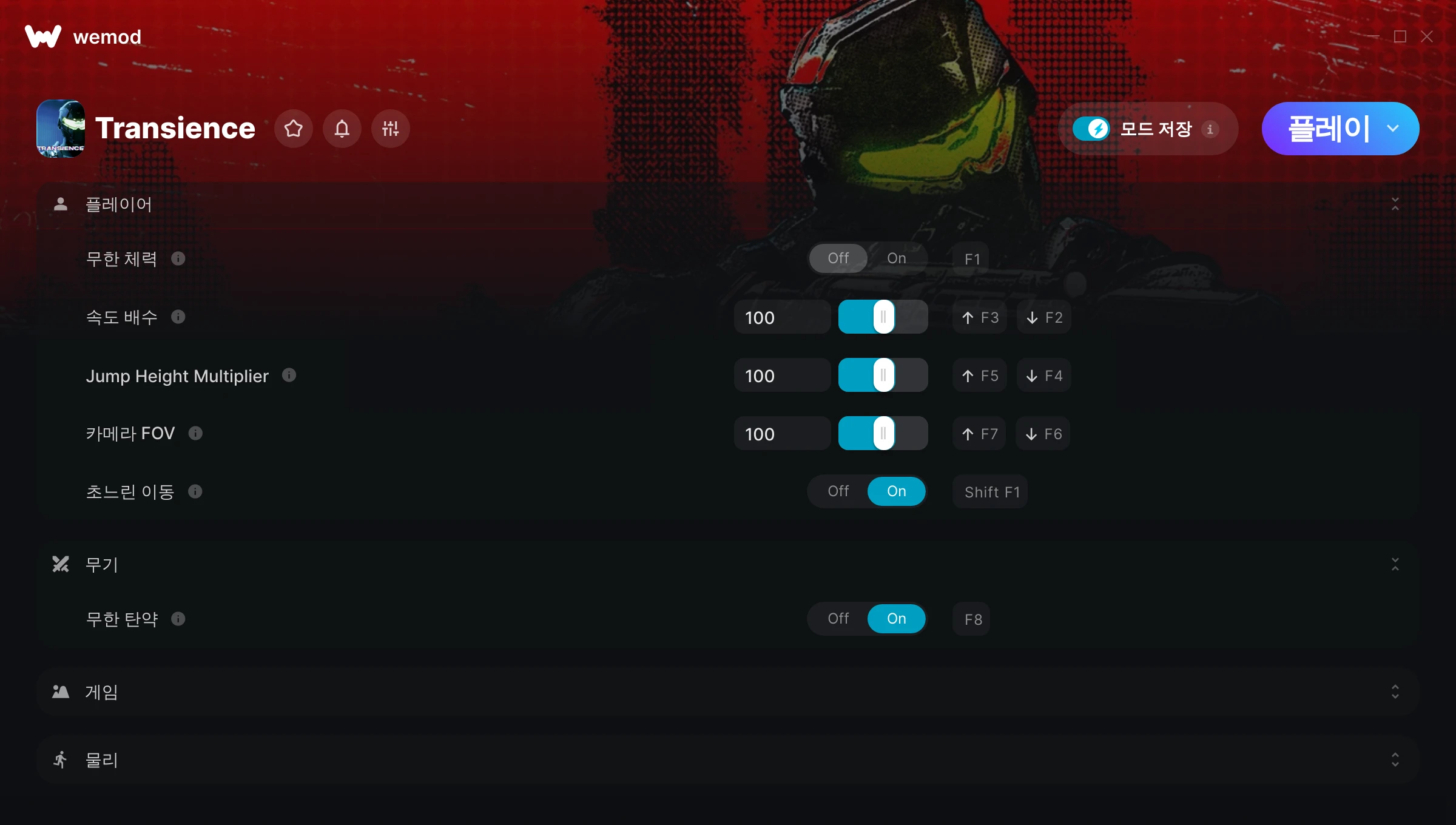 Transience에서 치트를 사용하려면 어떻게 해야 하나요?WeMod는 PC의 모든 게임을 표시합니다. 목록에서 게임을 선택하고 플레이를 누르세요. 게임을 시작하면 다양한 치트를 활성화할 수 있습니다!모드가 제 게임 버전과 호환될까요?WeMod는 고급 기술로 실행 중인 게임 버전을 탐지하고 모드 지원 여부를 표시합니다. 모드가 지원되지 않는다면 모드를 테스트해보거나 업데이트를 요청할 수 있습니다!