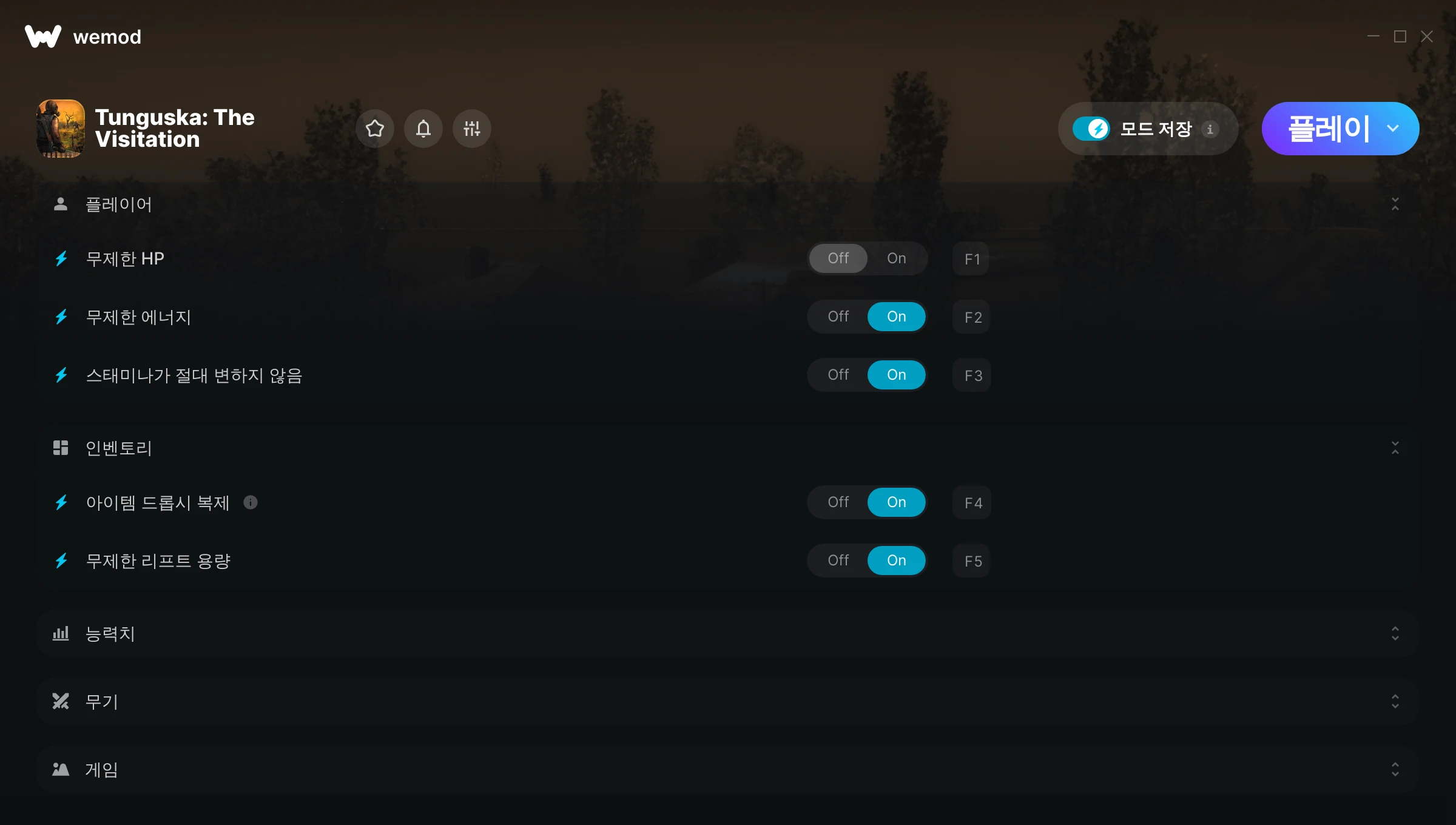 Tunguska: The Visitation에서 치트를 사용하려면 어떻게 해야 하나요?WeMod는 PC의 모든 게임을 표시합니다. 목록에서 게임을 선택하고 플레이를 누르세요. 게임을 시작하면 다양한 치트를 활성화할 수 있습니다!모드가 제 게임 버전과 호환될까요?WeMod는 고급 기술로 실행 중인 게임 버전을 탐지하고 모드 지원 여부를 표시합니다. 모드가 지원되지 않는다면 모드를 테스트해보거나 업데이트를 요청할 수 있습니다!