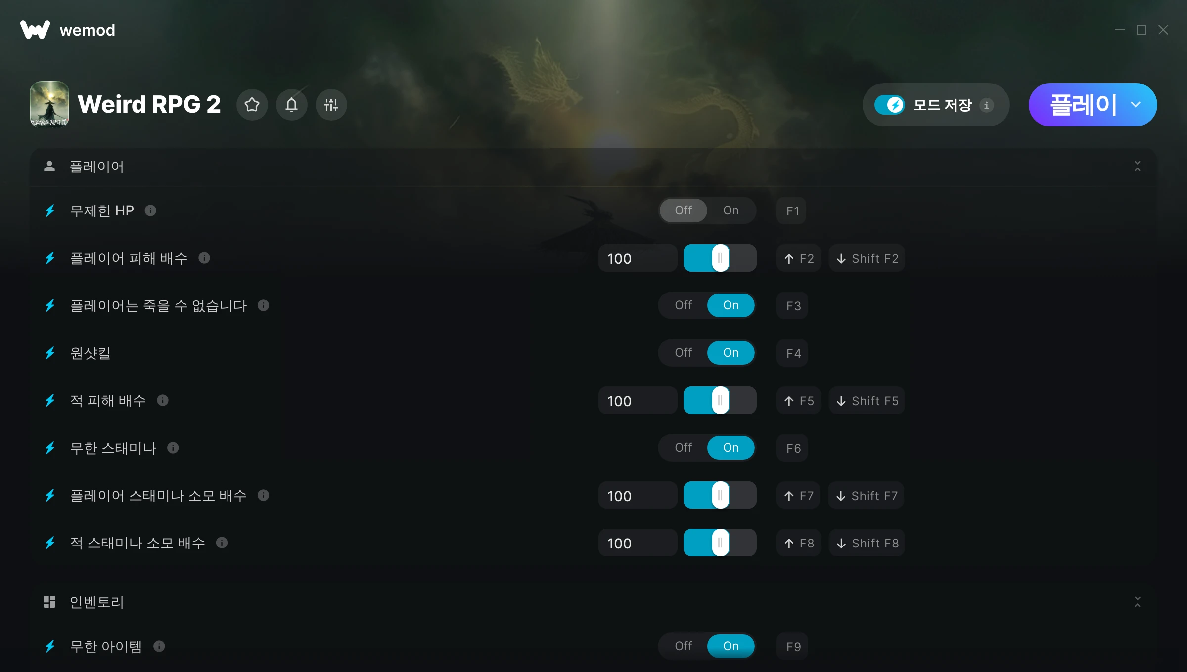 Weird RPG 2에서 치트를 사용하려면 어떻게 해야 하나요?WeMod는 PC의 모든 게임을 표시합니다. 목록에서 게임을 선택하고 플레이를 누르세요. 게임을 시작하면 다양한 치트를 활성화할 수 있습니다!모드가 제 게임 버전과 호환될까요?WeMod는 고급 기술로 실행 중인 게임 버전을 탐지하고 모드 지원 여부를 표시합니다. 모드가 지원되지 않는다면 모드를 테스트해보거나 업데이트를 요청할 수 있습니다!