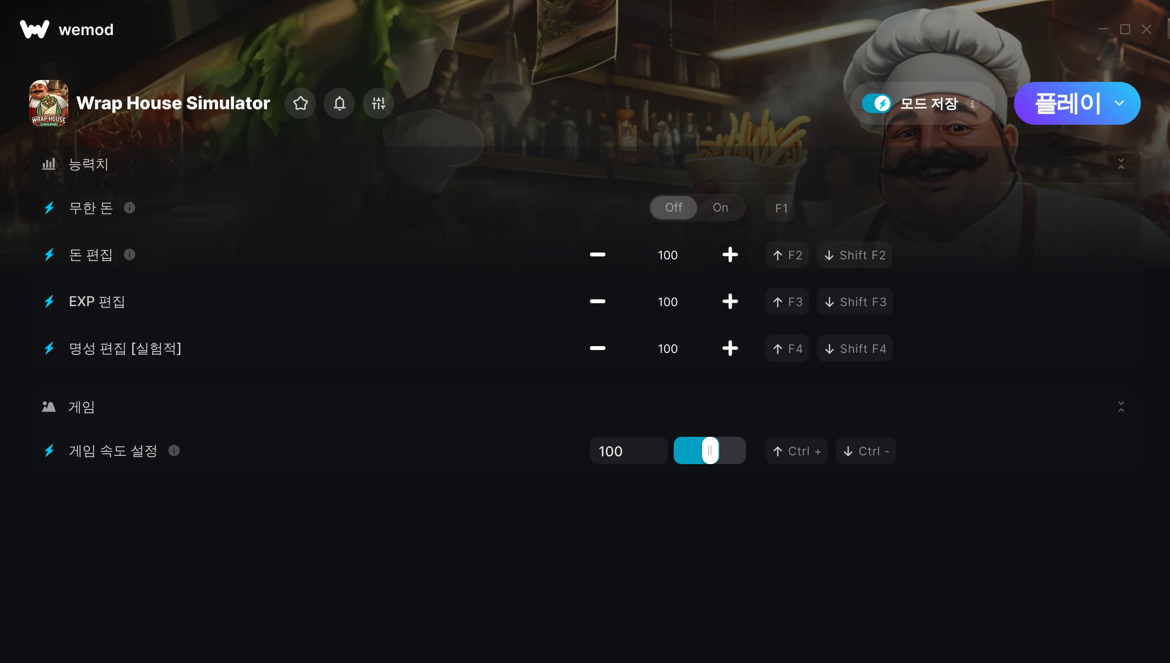Wrap House Simulator에서 치트를 사용하려면 어떻게 해야 하나요?WeMod는 PC의 모든 게임을 표시합니다. 목록에서 게임을 선택하고 플레이를 누르세요. 게임을 시작하면 다양한 치트를 활성화할 수 있습니다!모드가 제 게임 버전과 호환될까요?WeMod는 고급 기술로 실행 중인 게임 버전을 탐지하고 모드 지원 여부를 표시합니다. 모드가 지원되지 않는다면 모드를 테스트해보거나 업데이트를 요청할 수 있습니다!
