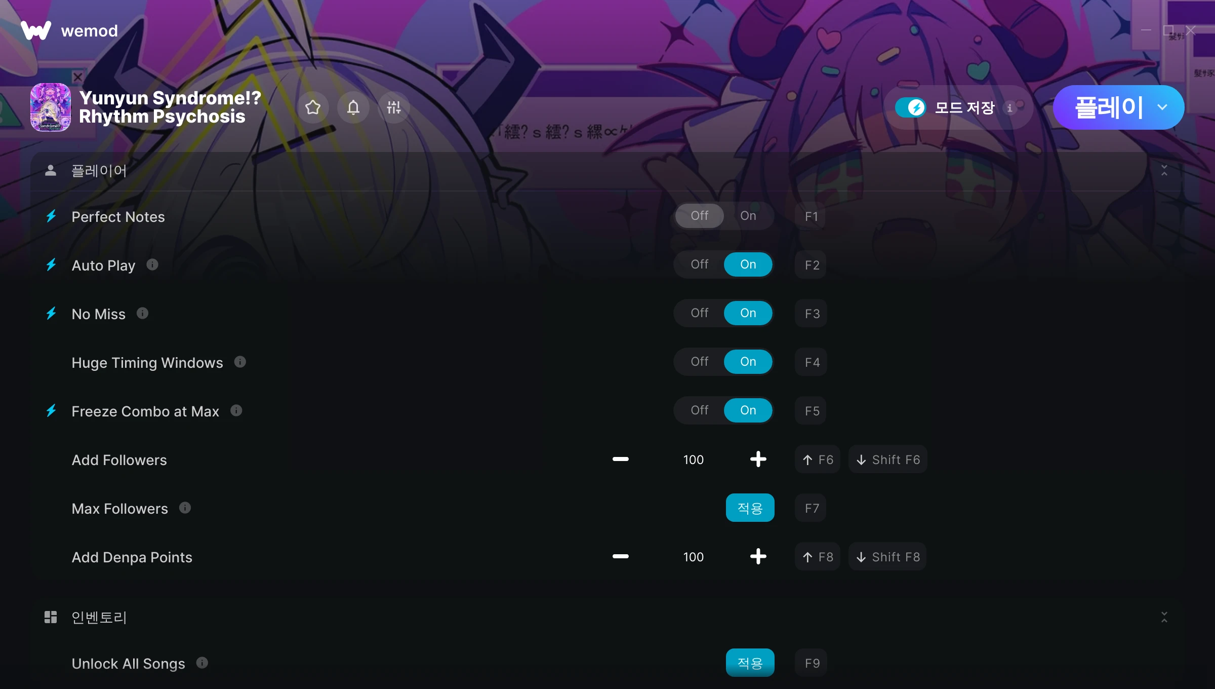 Yunyun Syndrome!? Rhythm Psychosis에서 치트를 사용하려면 어떻게 해야 하나요?WeMod는 PC의 모든 게임을 표시합니다. 목록에서 게임을 선택하고 플레이를 누르세요. 게임을 시작하면 다양한 치트를 활성화할 수 있습니다!모드가 제 게임 버전과 호환될까요?WeMod는 고급 기술로 실행 중인 게임 버전을 탐지하고 모드 지원 여부를 표시합니다. 모드가 지원되지 않는다면 모드를 테스트해보거나 업데이트를 요청할 수 있습니다!