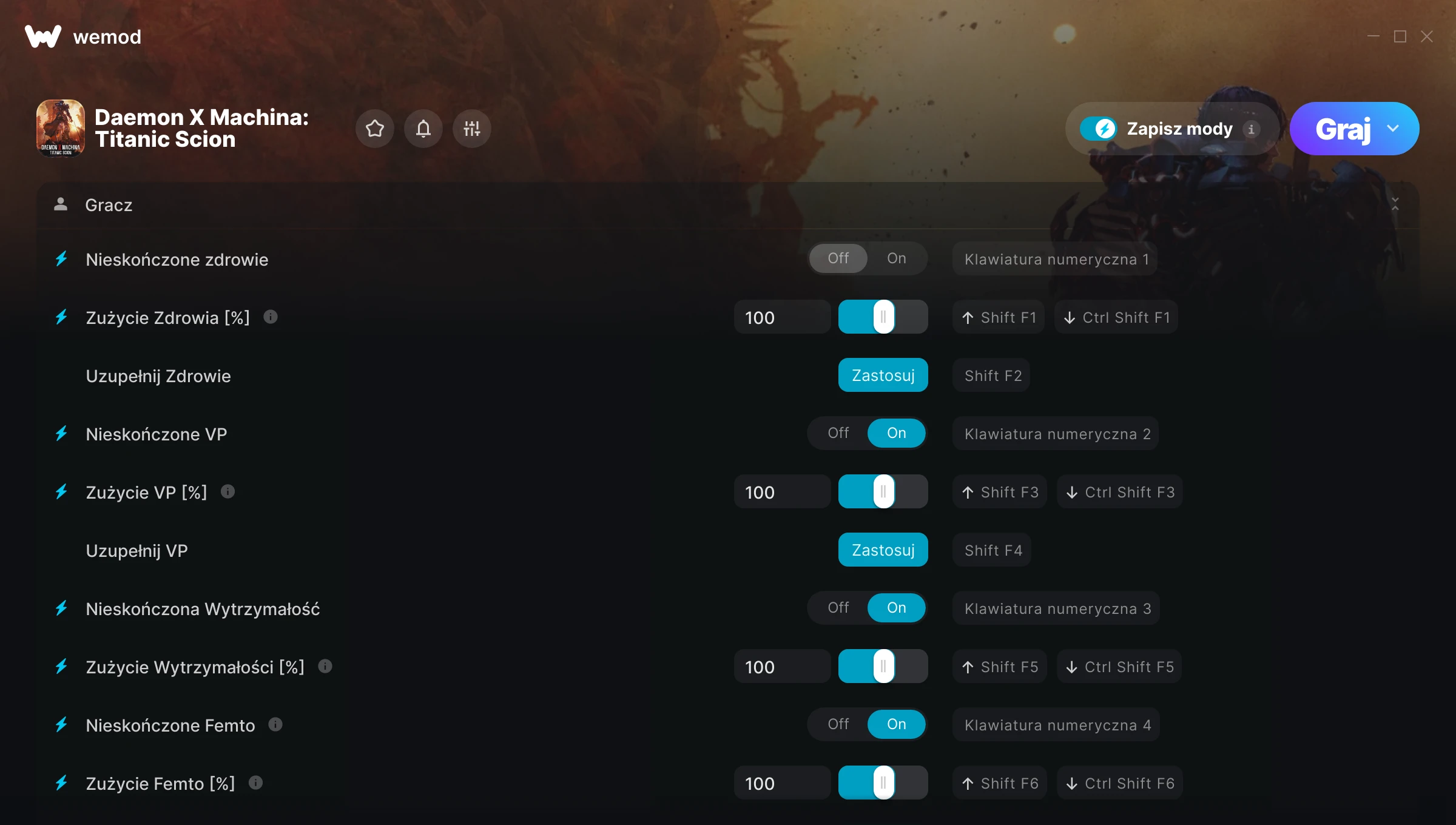85MB Windows ...lub odwiedź nas na swoim komputerze, aby pobrać aplikację Pobierz Nieskończone zdrowie, Zużycie Zdrowia [%] & 30 inny mod for Daemon X Machina: Titanic Scion with WeMod