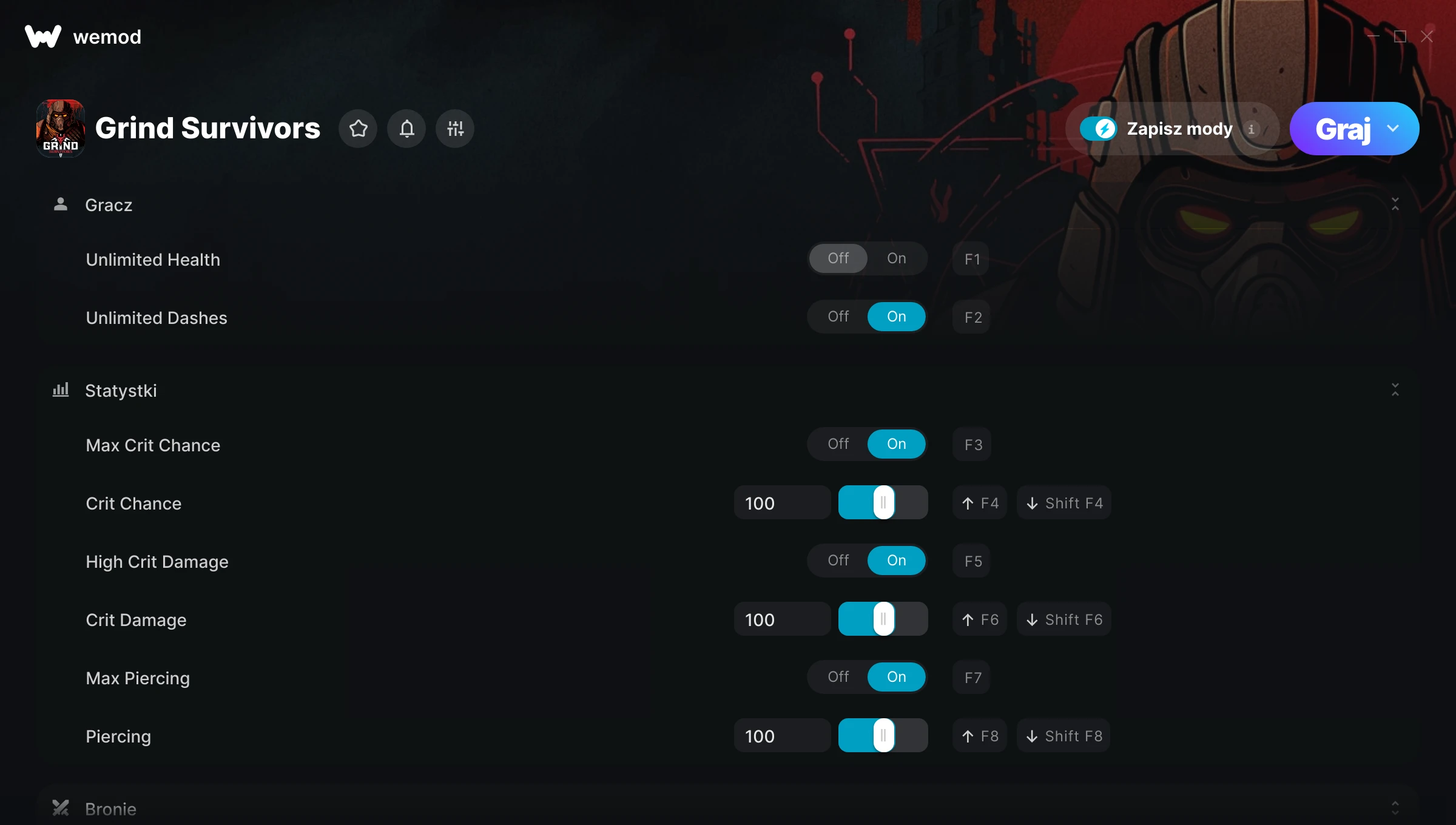 85MB Windows ...lub odwiedź nas na swoim komputerze, aby pobrać aplikację Pobierz Unlimited Health, Unlimited Dashes & 13 inny mod for Grind Survivors with WeMod