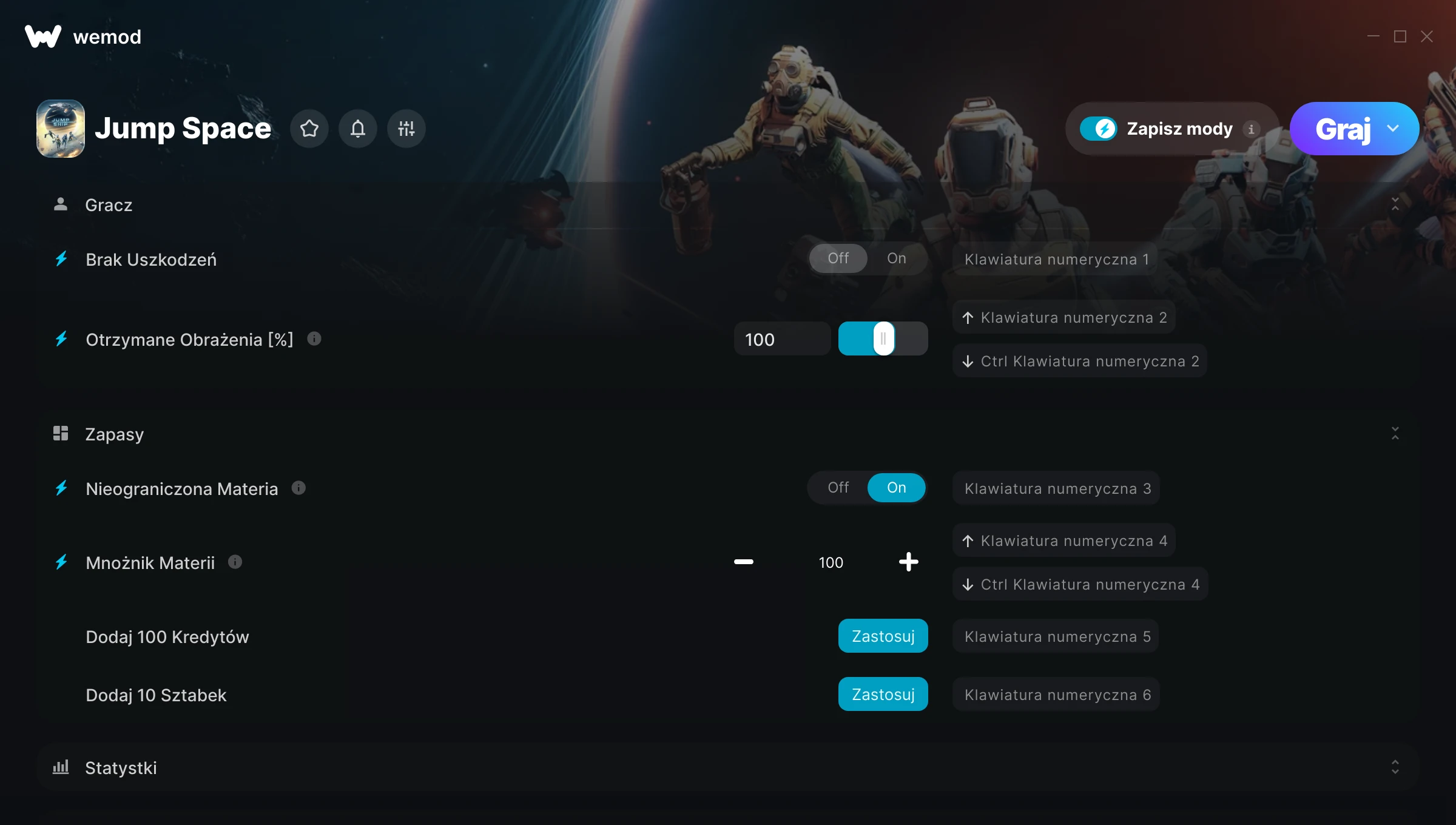 85MB Windows ...lub odwiedź nas na swoim komputerze, aby pobrać aplikację Pobierz Brak Uszkodzeń, Otrzymane Obrażenia [%] & 19 inny mod for Jump Space with WeMod