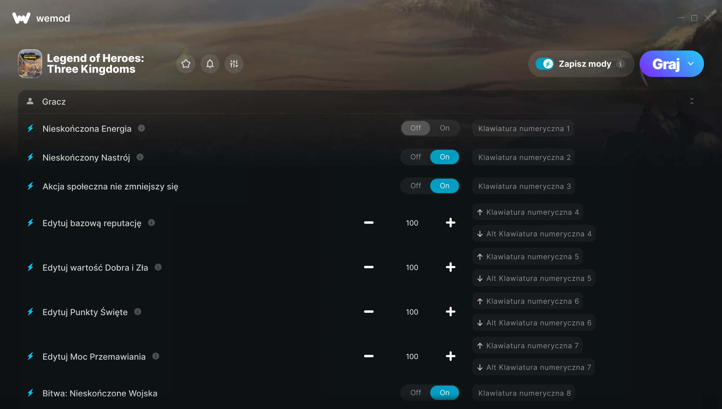 Dowiedz się więcejWeMod jest zawsze bezpieczny i darmowy dzięki naszej wielomilionowej społeczności graczy na całym świecie. Jesteśmy wspierani przez subskrybentów WeMod Pro. Sprawdź nasze recenzje na Trustpilot.