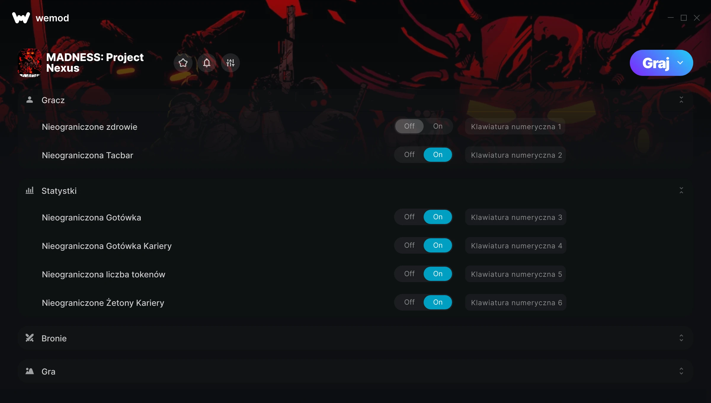 WeMod będzie bezpiecznie wyświetlał wszystkie gry na Twoim komputerze. Otwórz grę z listy i po prostu naciśnij „graj”. Po uruchomieniu gry możesz włączać różne cheaty!