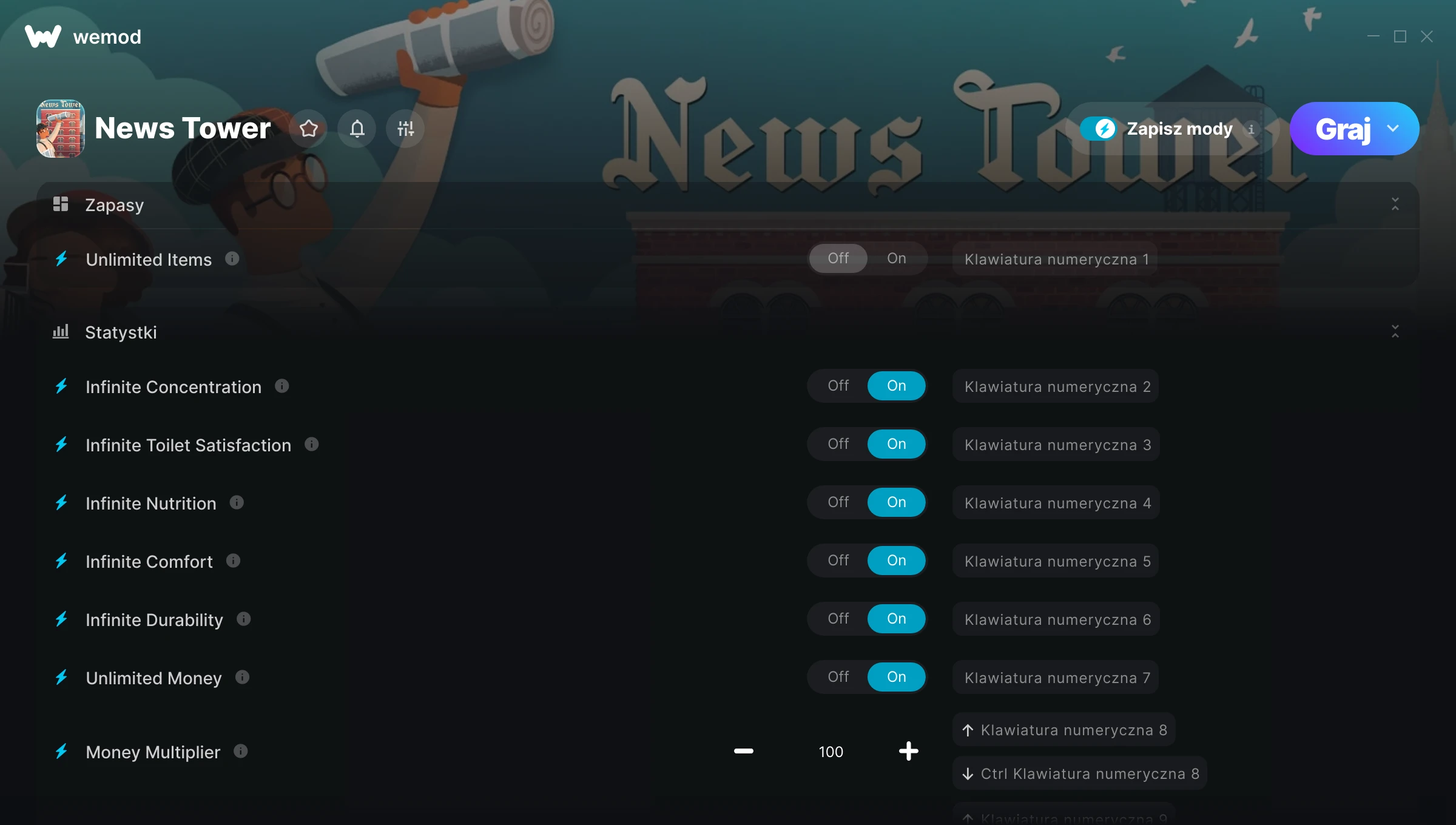 85MB Windows ...lub odwiedź nas na swoim komputerze, aby pobrać aplikację Pobierz Nielimitowane przedmioty, Nieskończona Koncentracja & 15 inny mod for News Tower with WeMod