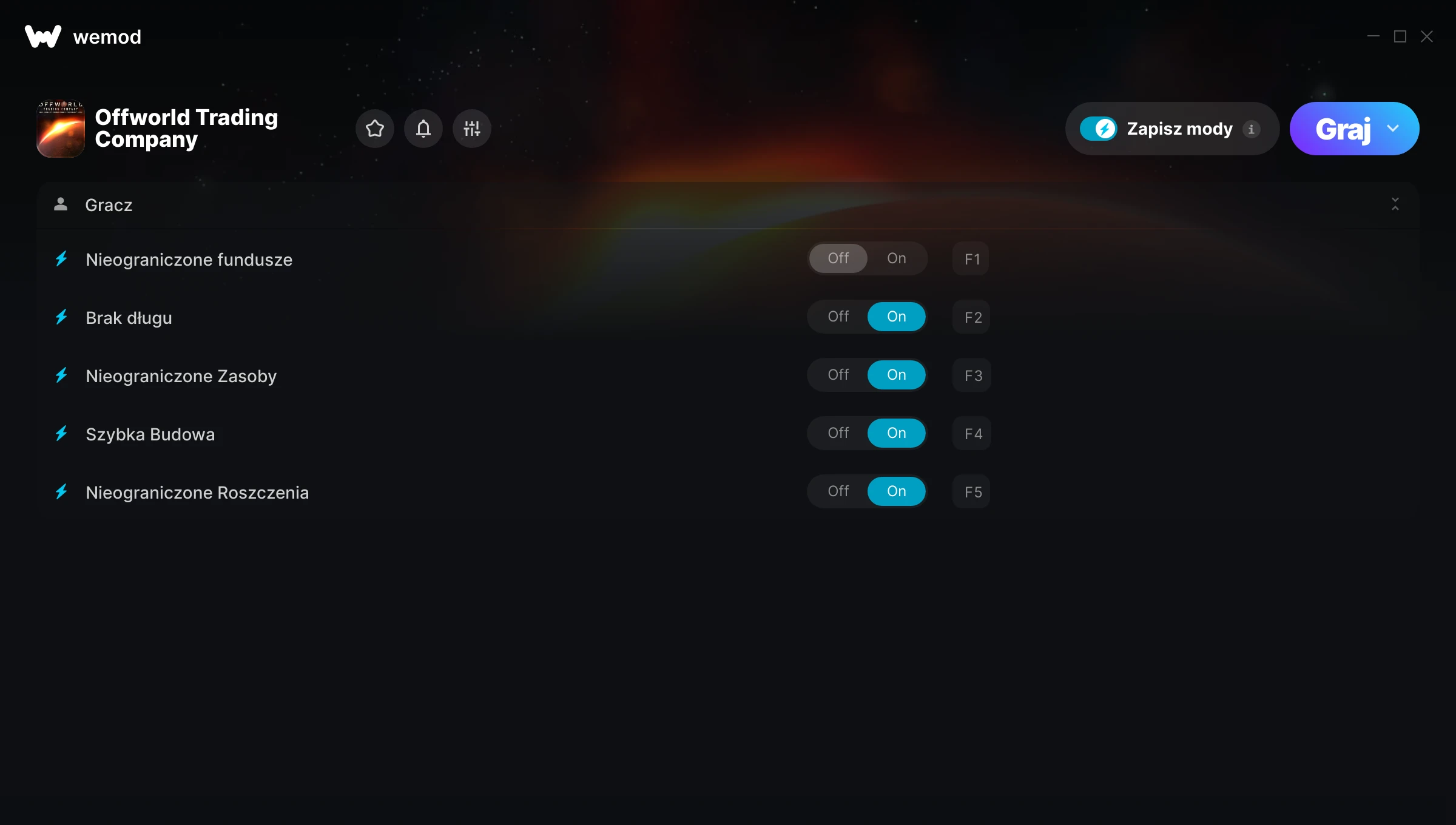 Dowiedz się więcejWeMod jest zawsze bezpieczny i darmowy dzięki naszej wielomilionowej społeczności graczy na całym świecie. Jesteśmy wspierani przez subskrybentów WeMod Pro. Sprawdź nasze recenzje na Trustpilot.