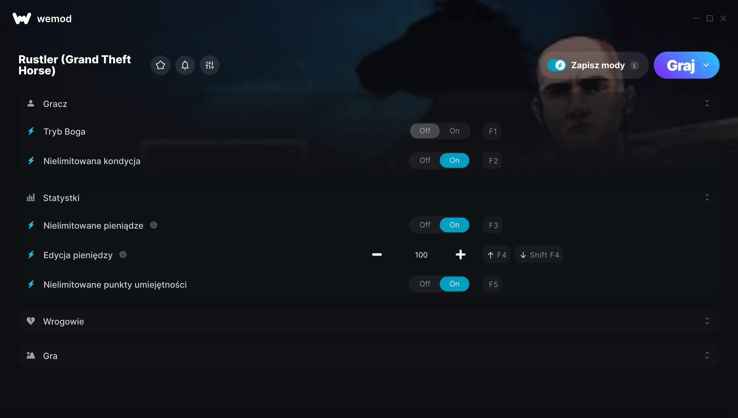 85MB Windows ...lub odwiedź nas na swoim komputerze, aby pobrać aplikację Pobierz Tryb Boga, Nielimitowana kondycja & 6 inny mod for Rustler (Grand Theft Horse) with WeMod