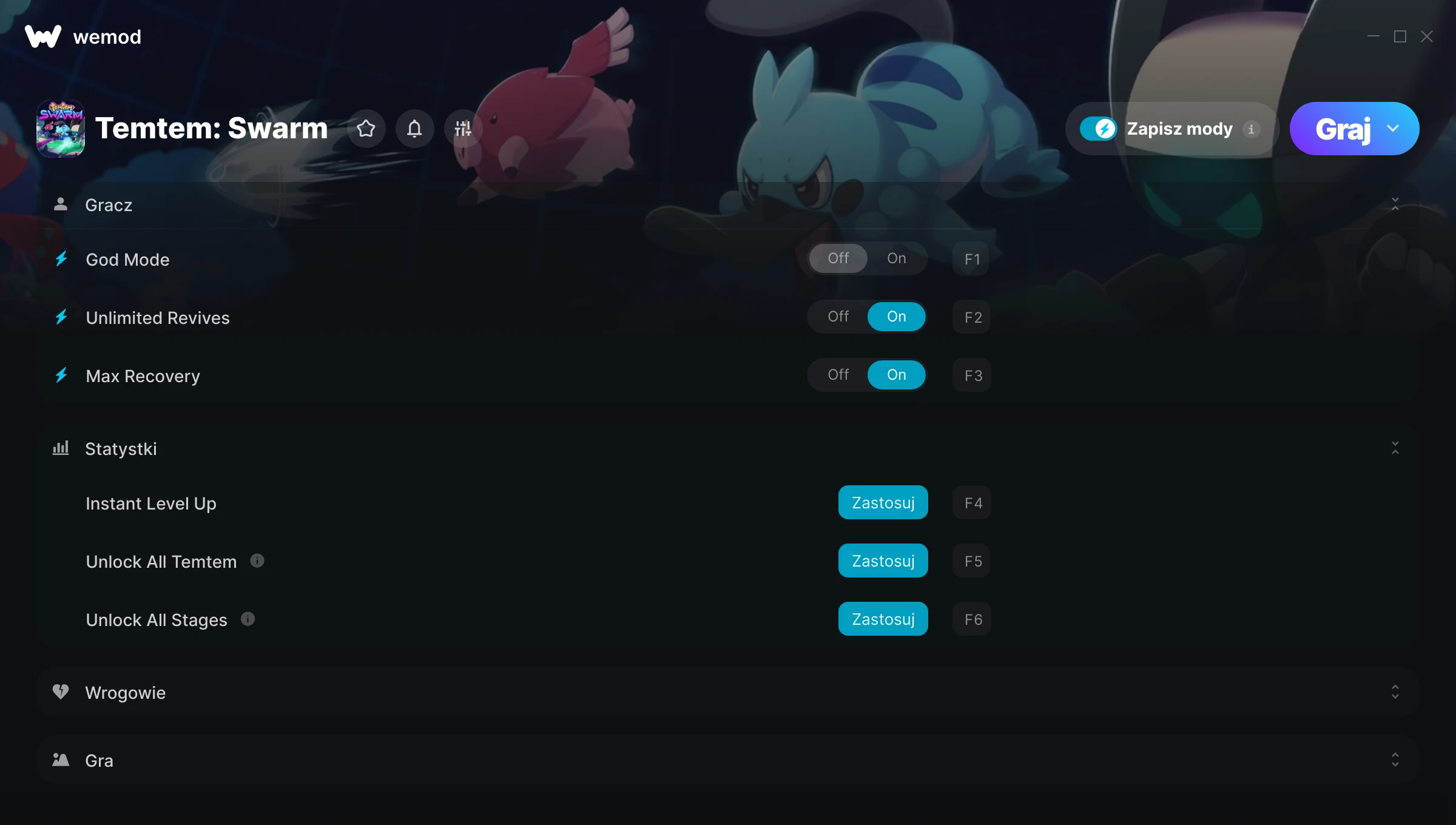 85MB Windows ...lub odwiedź nas na swoim komputerze, aby pobrać aplikację Pobierz God Mode, Unlimited Revives & 9 inny mod for Temtem: Swarm with WeMod