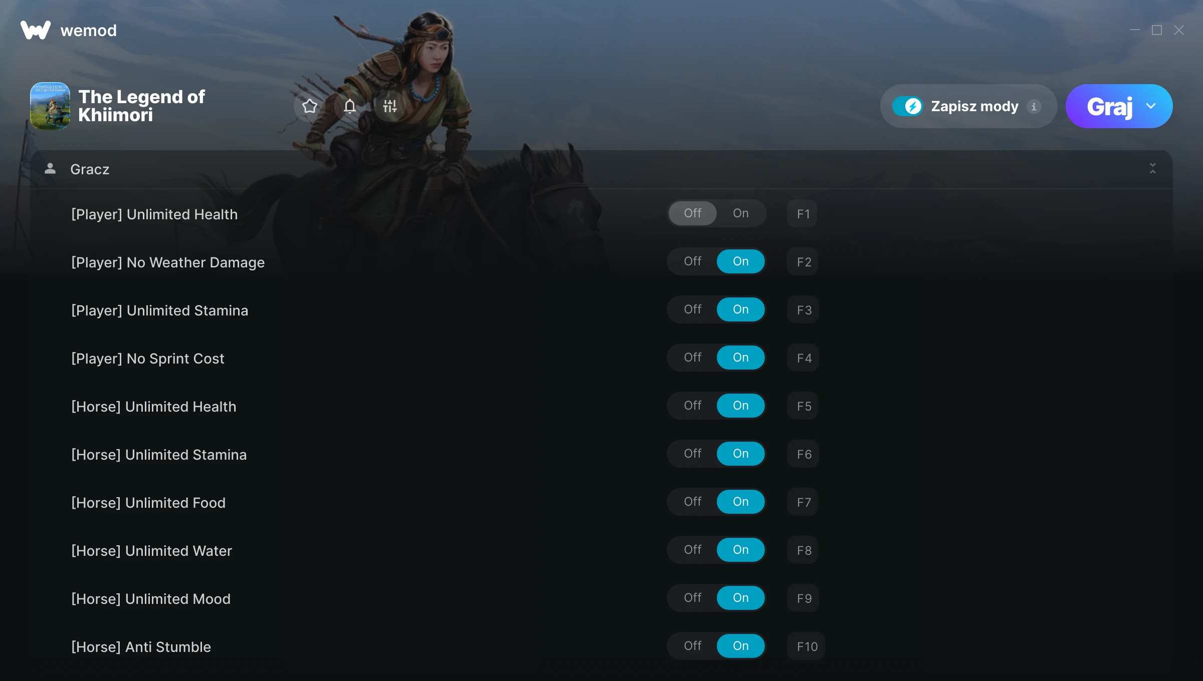 WeMod będzie bezpiecznie wyświetlał wszystkie gry na Twoim komputerze. Otwórz grę z listy i po prostu naciśnij „graj”. Po uruchomieniu gry możesz włączać różne cheaty!