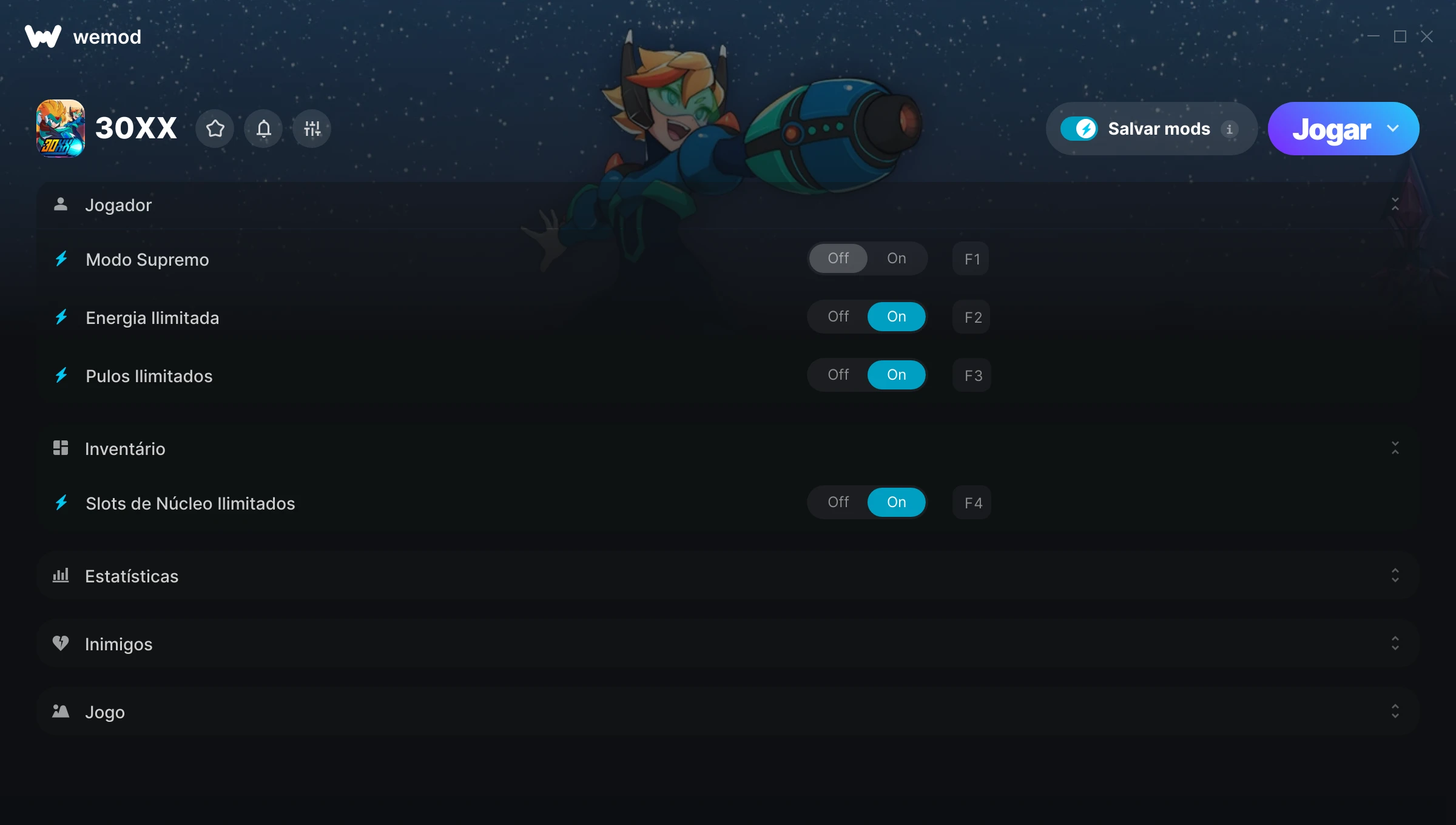 Como uso as trapaças em 30XX?O WeMod exibirá todos os jogos no seu PC com segurança. Abra um jogo da lista e simplesmente pressione Jogar. Depois que o jogo for carregado e você estiver no jogo, você poderá começar a ativar diferentes trapaças!Vai funcionar com a minha versão do jogo?O WeMod usa tecnologia avançada para detectar a versão do jogo que você está rodando e avisar se é suportada. Se não for, você ainda terá a opção de tentar assim mesmo ou solicitar uma atualização!