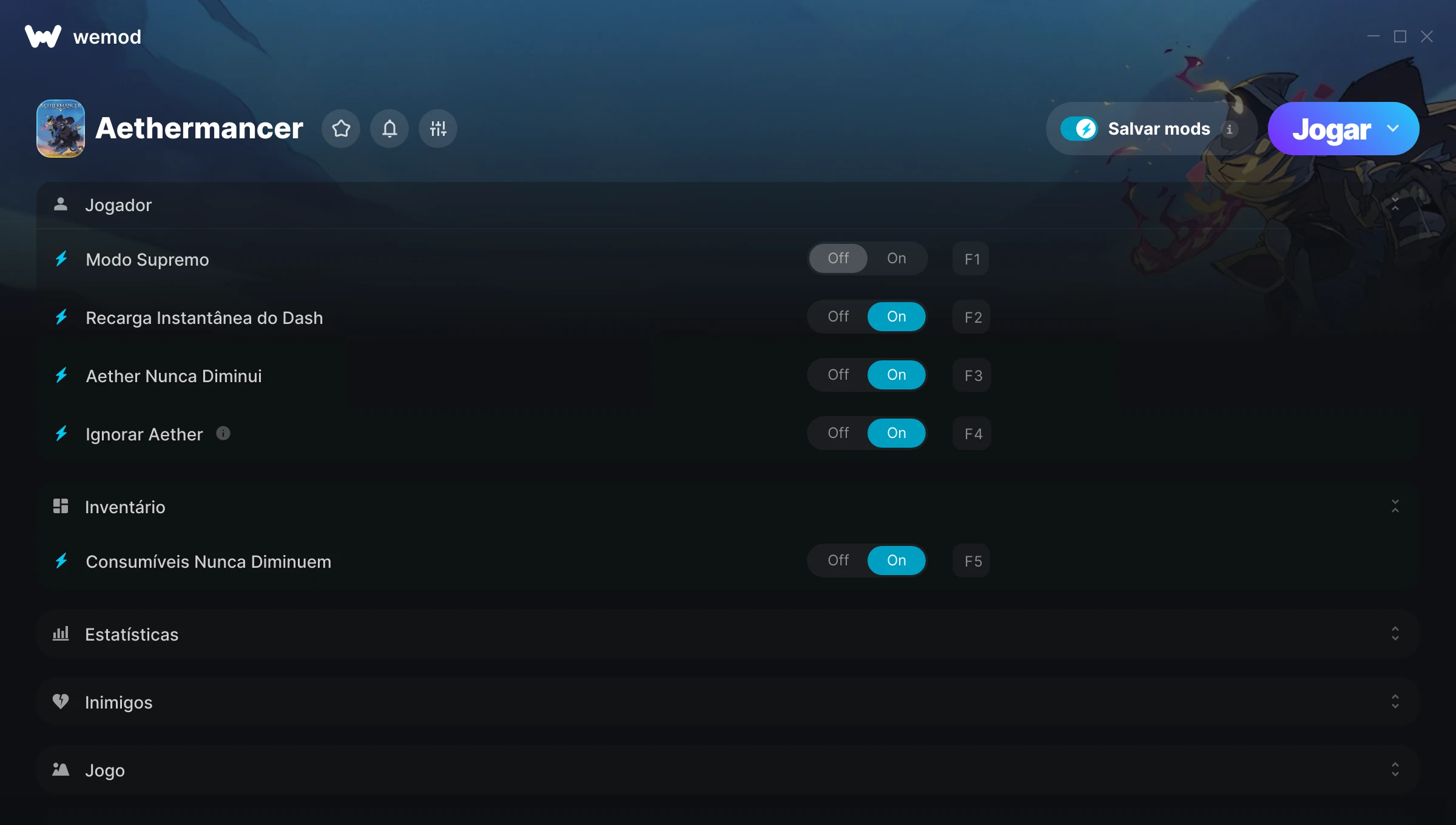 Como uso as trapaças em Aethermancer?O WeMod exibirá todos os jogos no seu PC com segurança. Abra um jogo da lista e simplesmente pressione Jogar. Depois que o jogo for carregado e você estiver no jogo, você poderá começar a ativar diferentes trapaças!Vai funcionar com a minha versão do jogo?O WeMod usa tecnologia avançada para detectar a versão do jogo que você está rodando e avisar se é suportada. Se não for, você ainda terá a opção de tentar assim mesmo ou solicitar uma atualização!