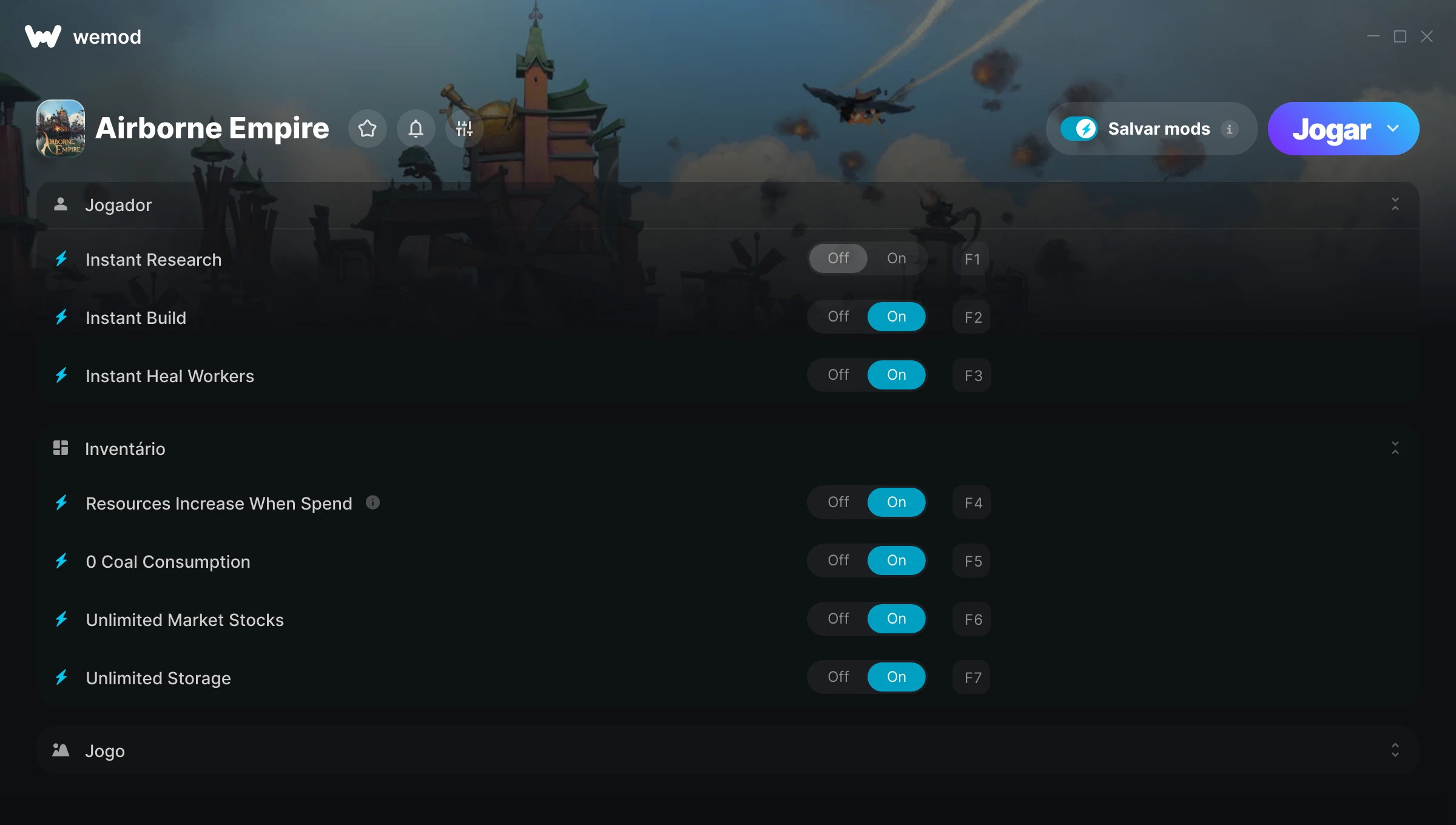 Como uso as trapaças em Airborne Empire?O WeMod exibirá todos os jogos no seu PC com segurança. Abra um jogo da lista e simplesmente pressione Jogar. Depois que o jogo for carregado e você estiver no jogo, você poderá começar a ativar diferentes trapaças!Vai funcionar com a minha versão do jogo?O WeMod usa tecnologia avançada para detectar a versão do jogo que você está rodando e avisar se é suportada. Se não for, você ainda terá a opção de tentar assim mesmo ou solicitar uma atualização!