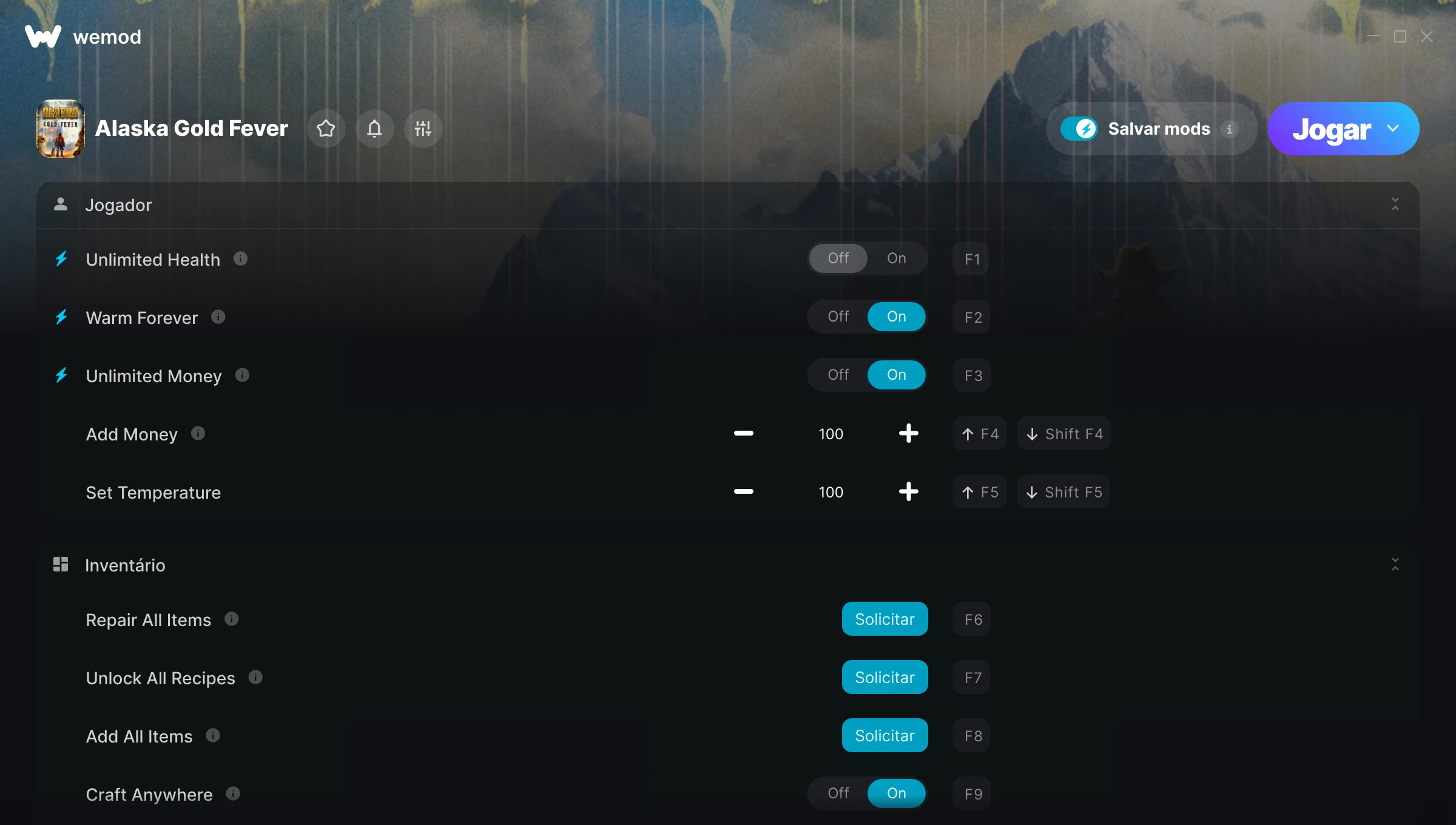 Como uso as trapaças em Alaska Gold Fever?O WeMod exibirá todos os jogos no seu PC com segurança. Abra um jogo da lista e simplesmente pressione Jogar. Depois que o jogo for carregado e você estiver no jogo, você poderá começar a ativar diferentes trapaças!Vai funcionar com a minha versão do jogo?O WeMod usa tecnologia avançada para detectar a versão do jogo que você está rodando e avisar se é suportada. Se não for, você ainda terá a opção de tentar assim mesmo ou solicitar uma atualização!