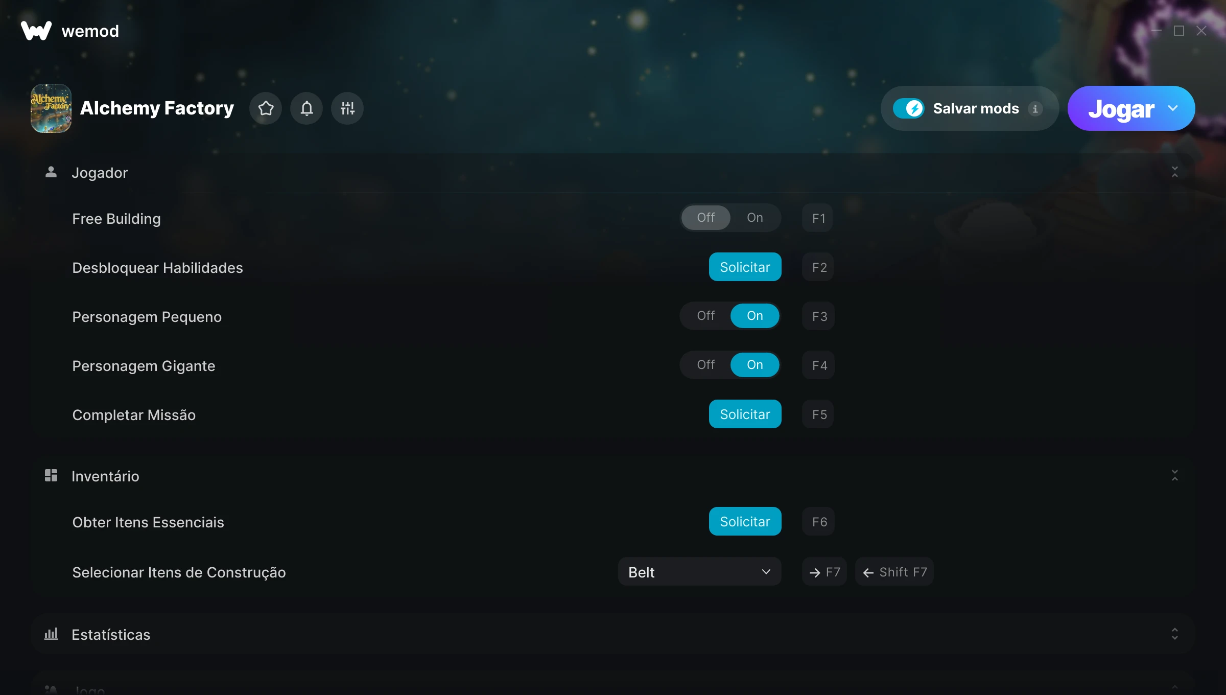 Como uso as trapaças em Alchemy Factory?O WeMod exibirá todos os jogos no seu PC com segurança. Abra um jogo da lista e simplesmente pressione Jogar. Depois que o jogo for carregado e você estiver no jogo, você poderá começar a ativar diferentes trapaças!Vai funcionar com a minha versão do jogo?O WeMod usa tecnologia avançada para detectar a versão do jogo que você está rodando e avisar se é suportada. Se não for, você ainda terá a opção de tentar assim mesmo ou solicitar uma atualização!