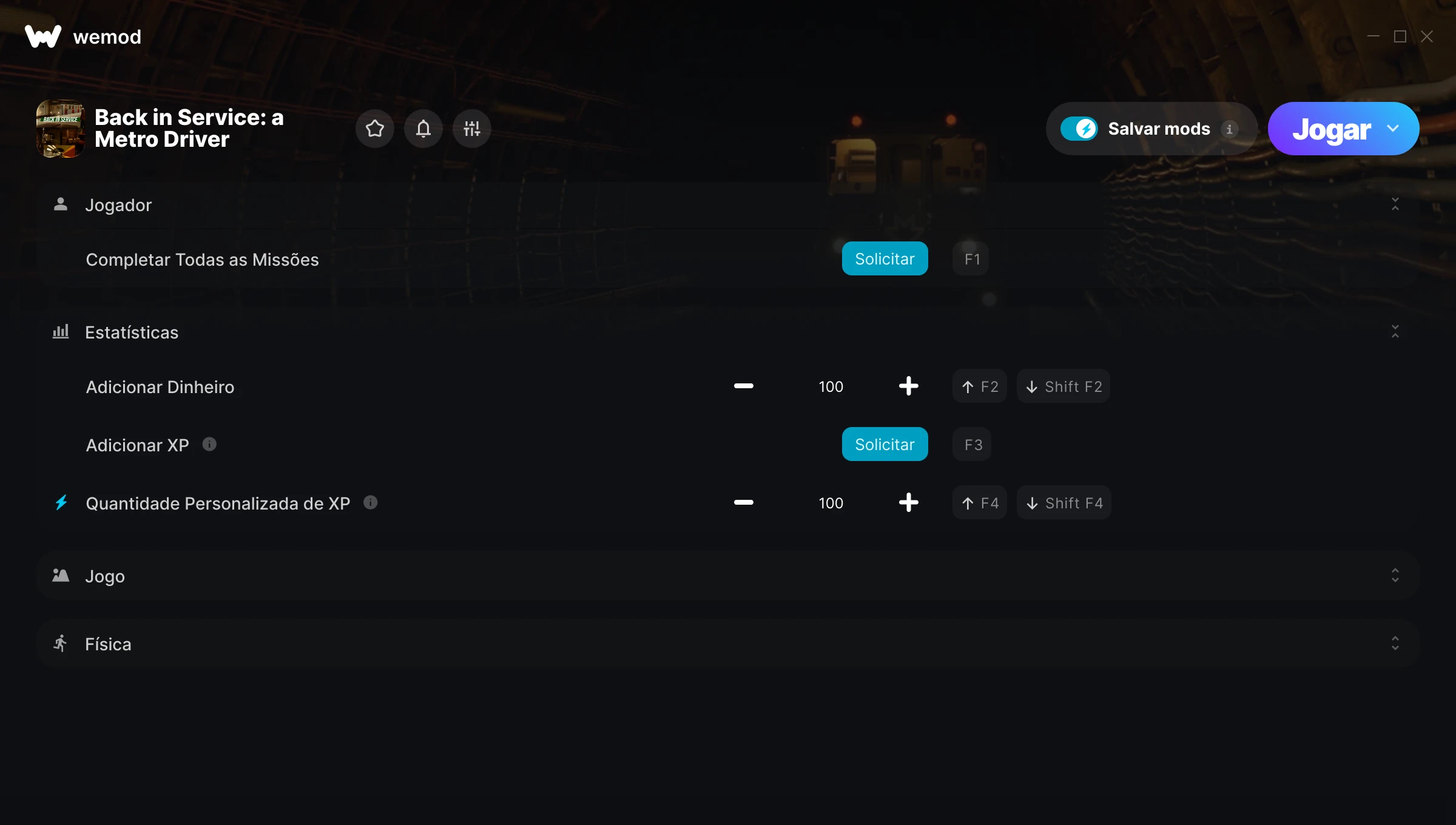 Como uso as trapaças em Back in Service: a Metro Driver?O WeMod exibirá todos os jogos no seu PC com segurança. Abra um jogo da lista e simplesmente pressione Jogar. Depois que o jogo for carregado e você estiver no jogo, você poderá começar a ativar diferentes trapaças!Vai funcionar com a minha versão do jogo?O WeMod usa tecnologia avançada para detectar a versão do jogo que você está rodando e avisar se é suportada. Se não for, você ainda terá a opção de tentar assim mesmo ou solicitar uma atualização!