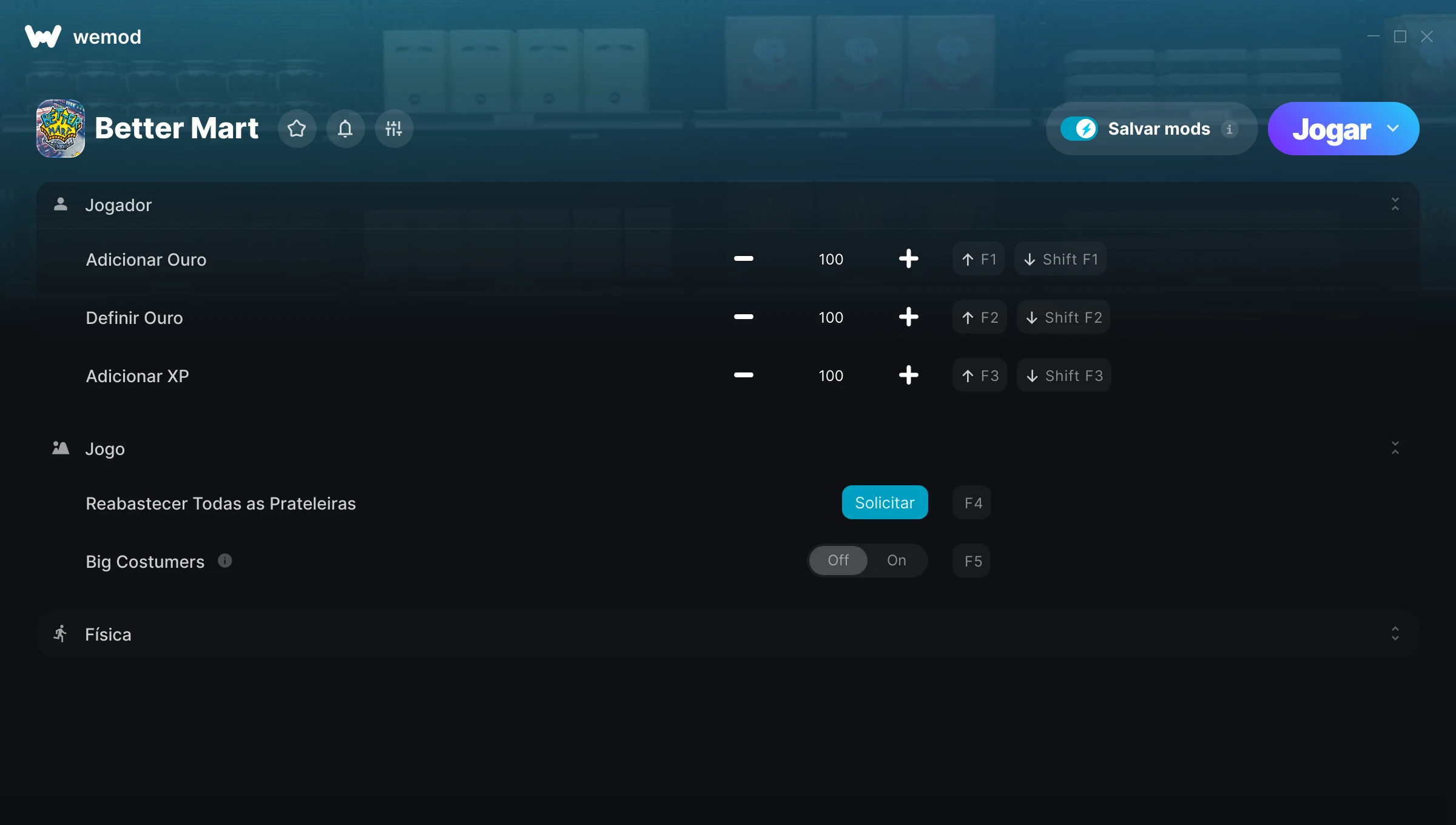 Como uso as trapaças em Better Mart?O WeMod exibirá todos os jogos no seu PC com segurança. Abra um jogo da lista e simplesmente pressione Jogar. Depois que o jogo for carregado e você estiver no jogo, você poderá começar a ativar diferentes trapaças!Vai funcionar com a minha versão do jogo?O WeMod usa tecnologia avançada para detectar a versão do jogo que você está rodando e avisar se é suportada. Se não for, você ainda terá a opção de tentar assim mesmo ou solicitar uma atualização!