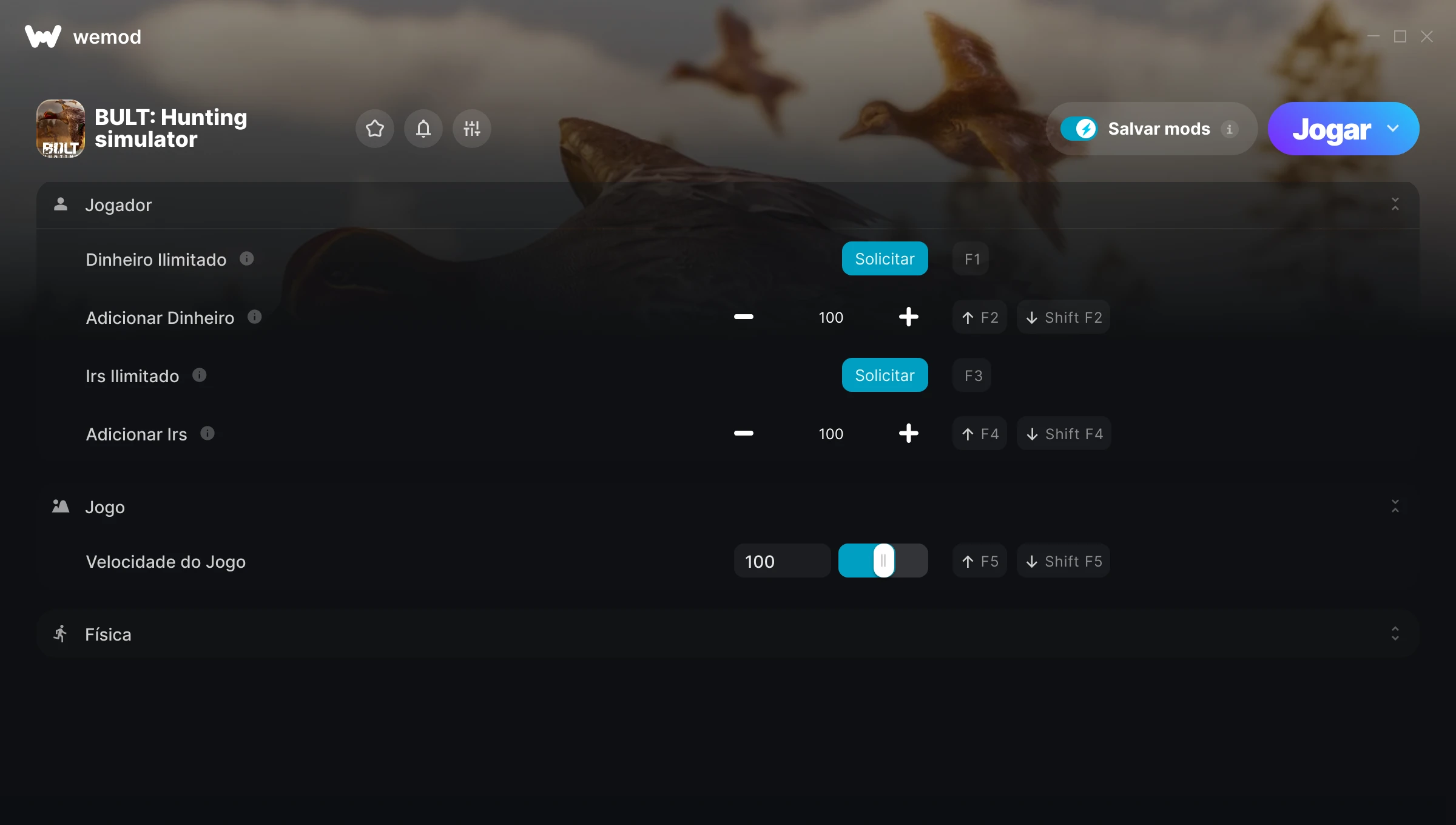 Como uso as trapaças em BULT: Hunting simulator?O WeMod exibirá todos os jogos no seu PC com segurança. Abra um jogo da lista e simplesmente pressione Jogar. Depois que o jogo for carregado e você estiver no jogo, você poderá começar a ativar diferentes trapaças!Vai funcionar com a minha versão do jogo?O WeMod usa tecnologia avançada para detectar a versão do jogo que você está rodando e avisar se é suportada. Se não for, você ainda terá a opção de tentar assim mesmo ou solicitar uma atualização!