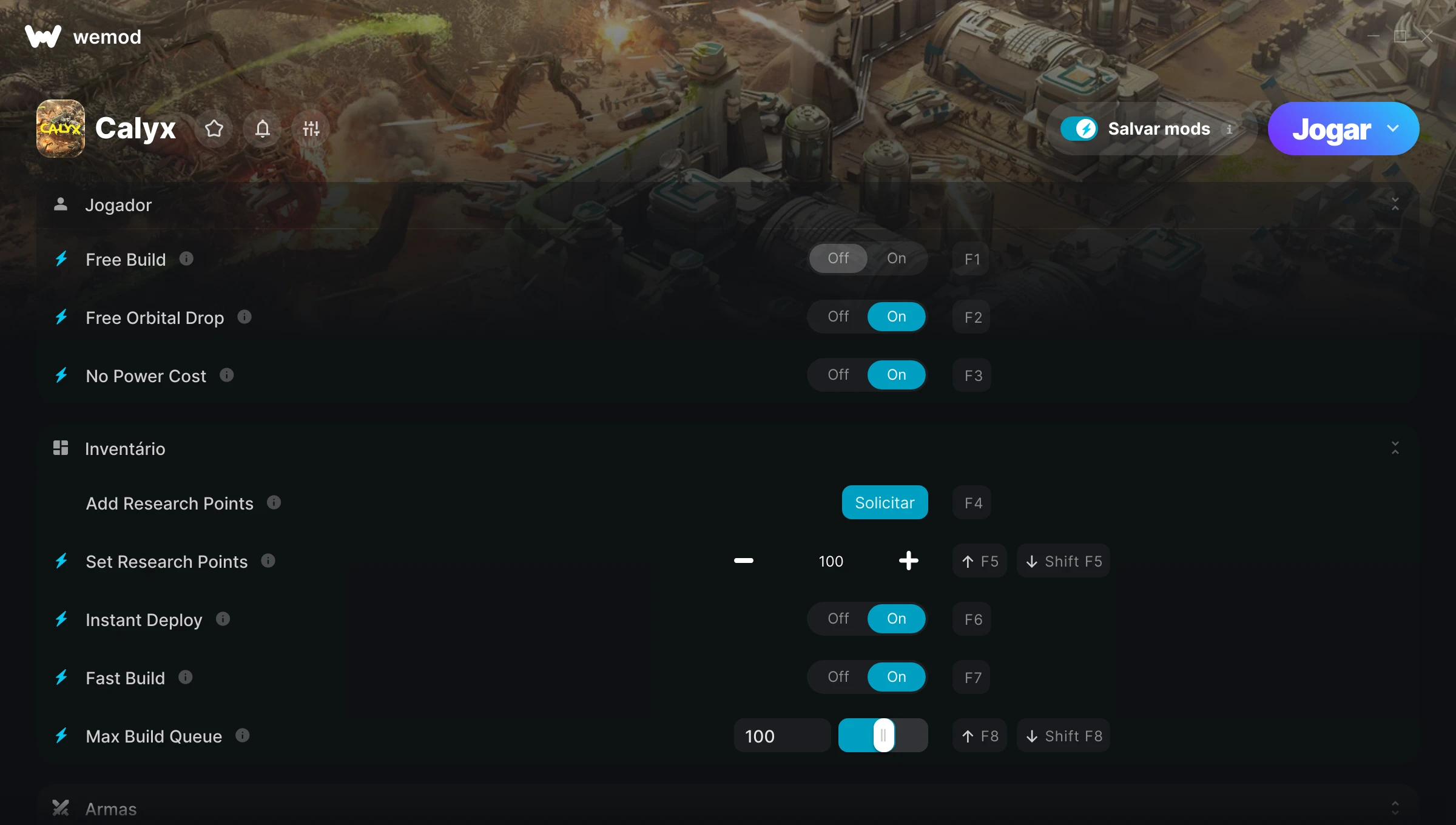 Como uso as trapaças em Calyx?O WeMod exibirá todos os jogos no seu PC com segurança. Abra um jogo da lista e simplesmente pressione Jogar. Depois que o jogo for carregado e você estiver no jogo, você poderá começar a ativar diferentes trapaças!Vai funcionar com a minha versão do jogo?O WeMod usa tecnologia avançada para detectar a versão do jogo que você está rodando e avisar se é suportada. Se não for, você ainda terá a opção de tentar assim mesmo ou solicitar uma atualização!