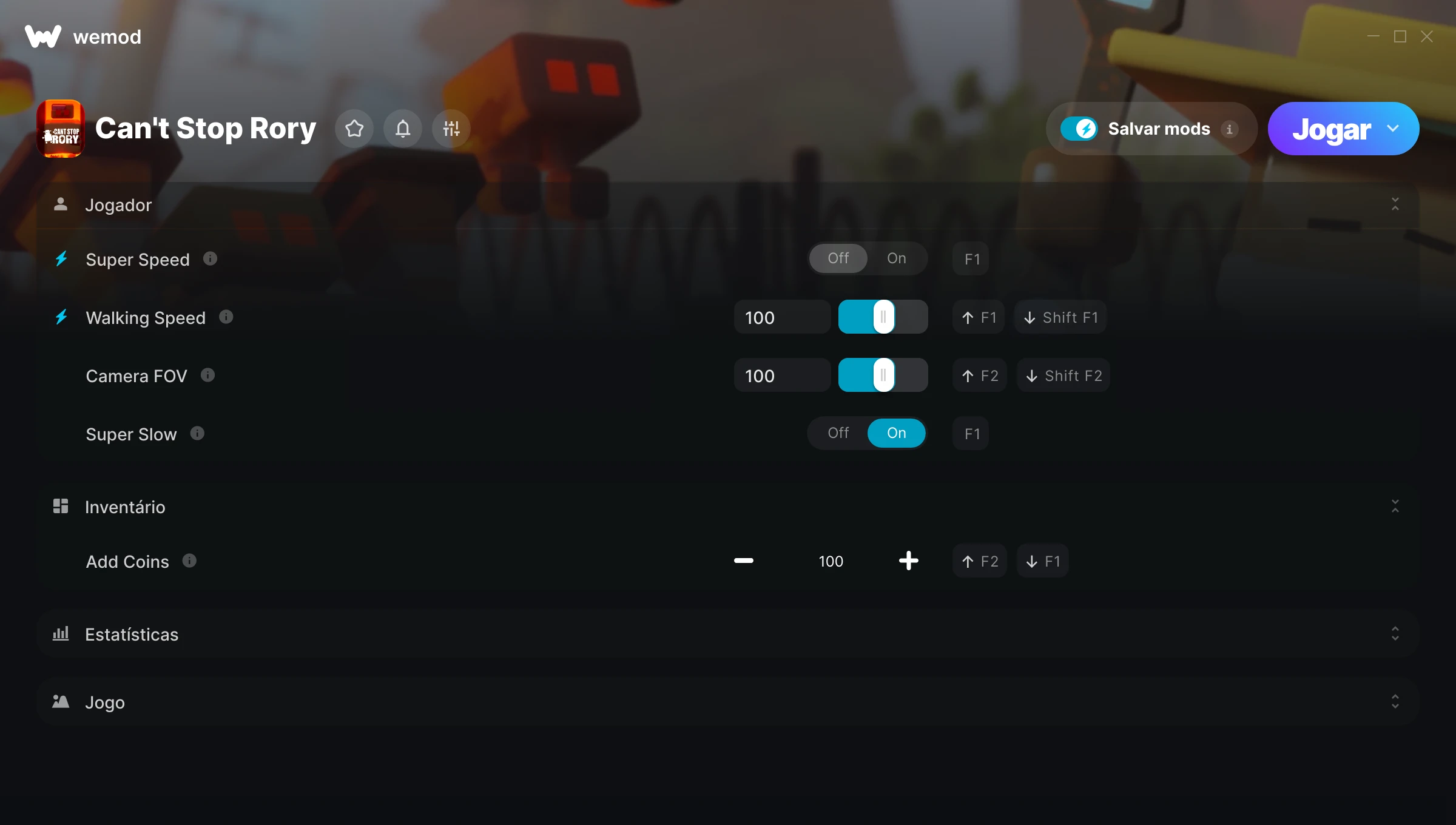 Como uso as trapaças em Can't Stop Rory?O WeMod exibirá todos os jogos no seu PC com segurança. Abra um jogo da lista e simplesmente pressione Jogar. Depois que o jogo for carregado e você estiver no jogo, você poderá começar a ativar diferentes trapaças!Vai funcionar com a minha versão do jogo?O WeMod usa tecnologia avançada para detectar a versão do jogo que você está rodando e avisar se é suportada. Se não for, você ainda terá a opção de tentar assim mesmo ou solicitar uma atualização!