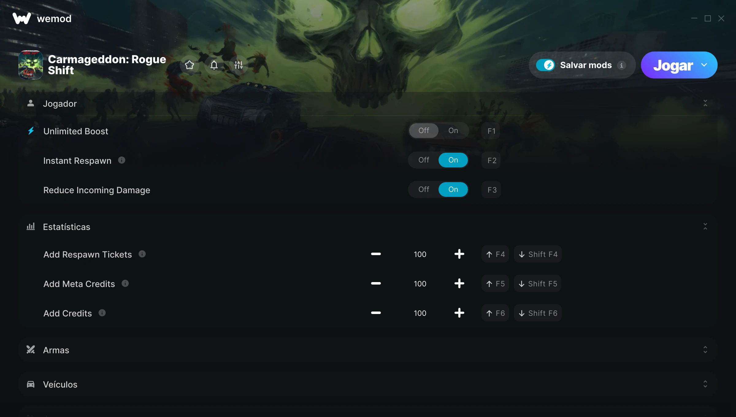 Como uso as trapaças em Carmageddon: Rogue Shift?O WeMod exibirá todos os jogos no seu PC com segurança. Abra um jogo da lista e simplesmente pressione Jogar. Depois que o jogo for carregado e você estiver no jogo, você poderá começar a ativar diferentes trapaças!Vai funcionar com a minha versão do jogo?O WeMod usa tecnologia avançada para detectar a versão do jogo que você está rodando e avisar se é suportada. Se não for, você ainda terá a opção de tentar assim mesmo ou solicitar uma atualização!
