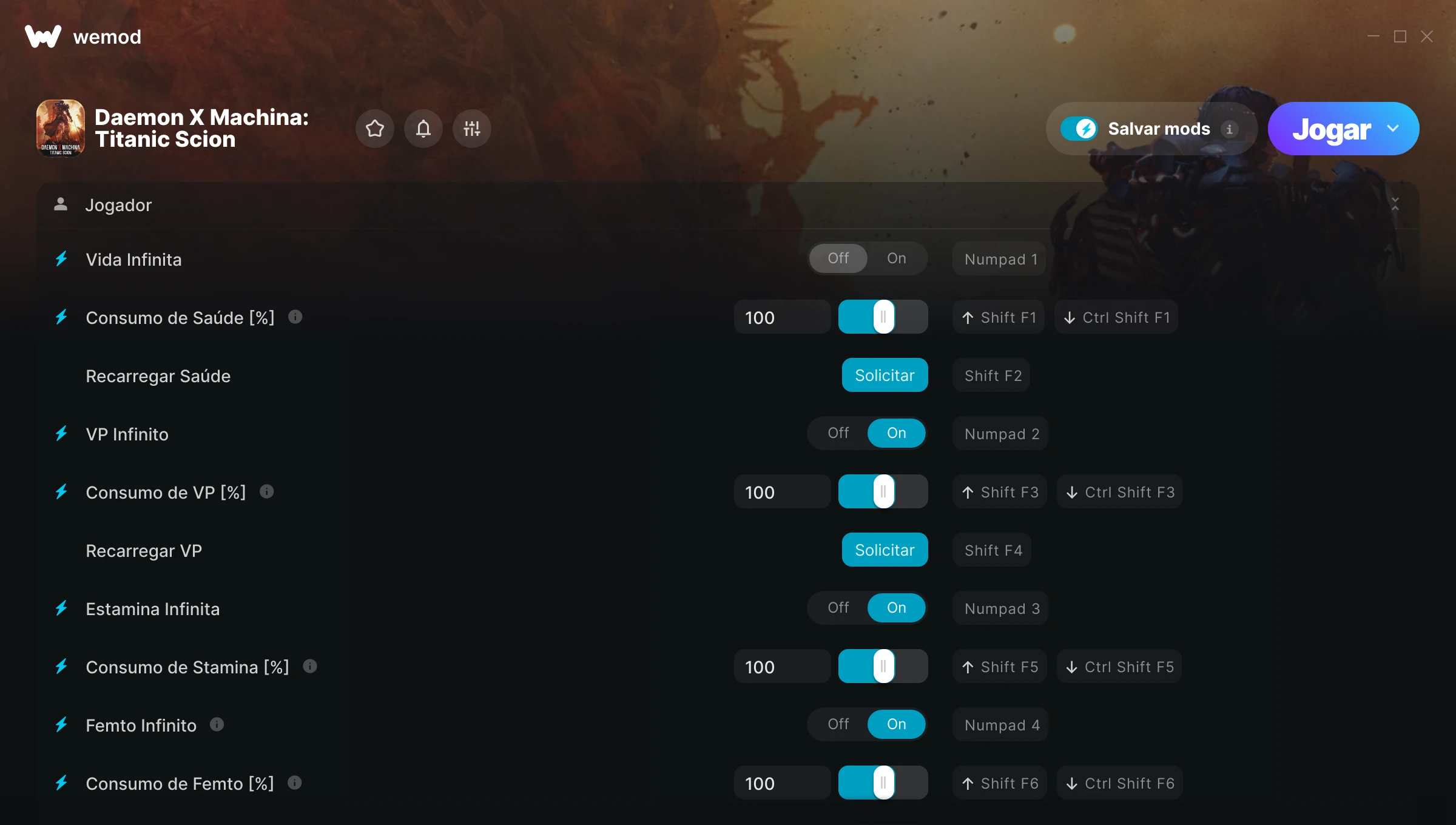Como uso as trapaças em Daemon X Machina: Titanic Scion?O WeMod exibirá todos os jogos no seu PC com segurança. Abra um jogo da lista e simplesmente pressione Jogar. Depois que o jogo for carregado e você estiver no jogo, você poderá começar a ativar diferentes trapaças!Vai funcionar com a minha versão do jogo?O WeMod usa tecnologia avançada para detectar a versão do jogo que você está rodando e avisar se é suportada. Se não for, você ainda terá a opção de tentar assim mesmo ou solicitar uma atualização!