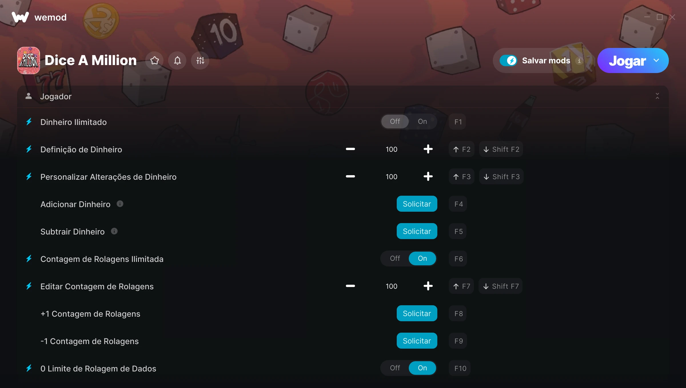 Como uso as trapaças em Dice A Million?O WeMod exibirá todos os jogos no seu PC com segurança. Abra um jogo da lista e simplesmente pressione Jogar. Depois que o jogo for carregado e você estiver no jogo, você poderá começar a ativar diferentes trapaças!Vai funcionar com a minha versão do jogo?O WeMod usa tecnologia avançada para detectar a versão do jogo que você está rodando e avisar se é suportada. Se não for, você ainda terá a opção de tentar assim mesmo ou solicitar uma atualização!