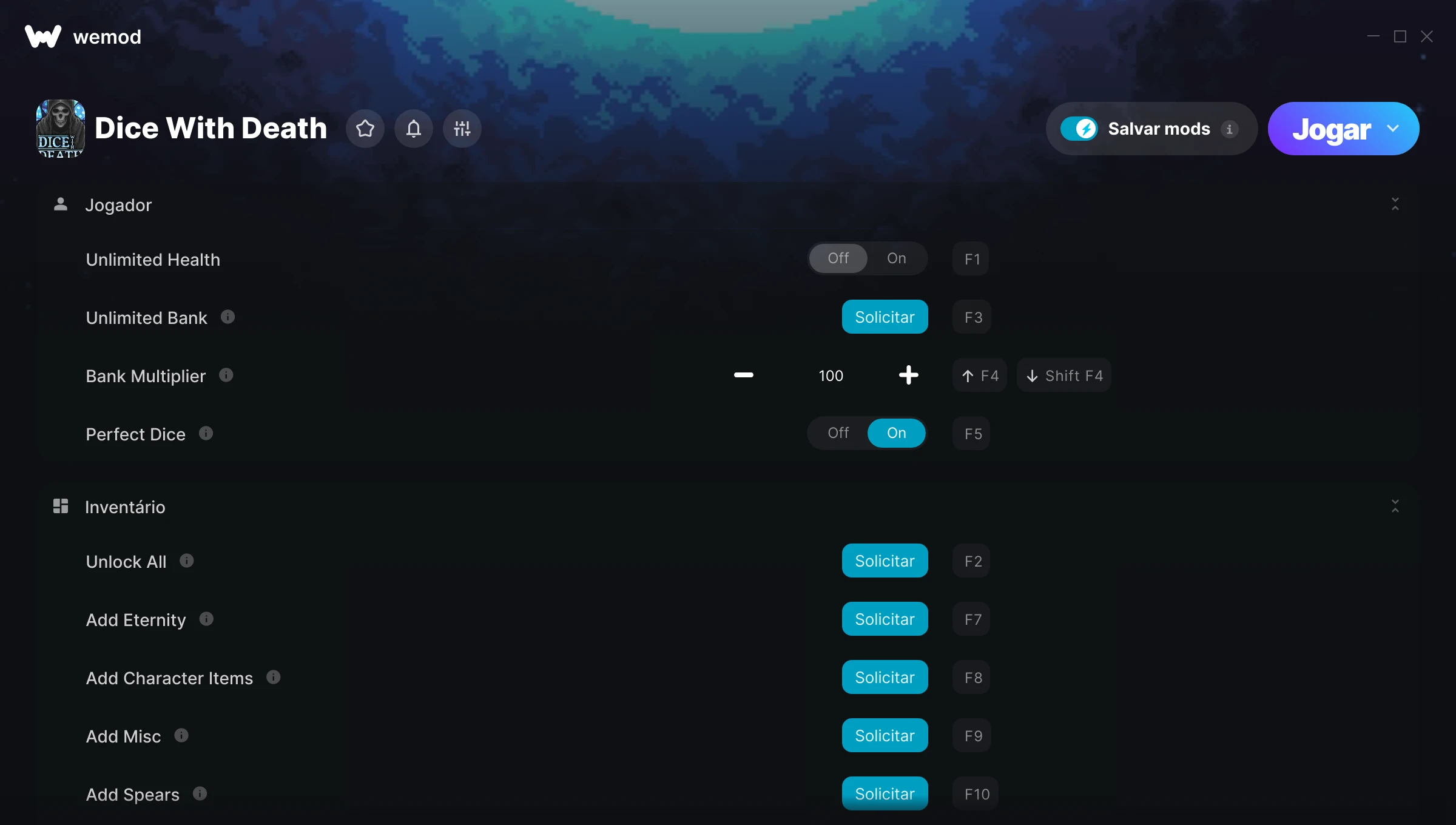 Como uso as trapaças em Dice With Death?O WeMod exibirá todos os jogos no seu PC com segurança. Abra um jogo da lista e simplesmente pressione Jogar. Depois que o jogo for carregado e você estiver no jogo, você poderá começar a ativar diferentes trapaças!Vai funcionar com a minha versão do jogo?O WeMod usa tecnologia avançada para detectar a versão do jogo que você está rodando e avisar se é suportada. Se não for, você ainda terá a opção de tentar assim mesmo ou solicitar uma atualização!