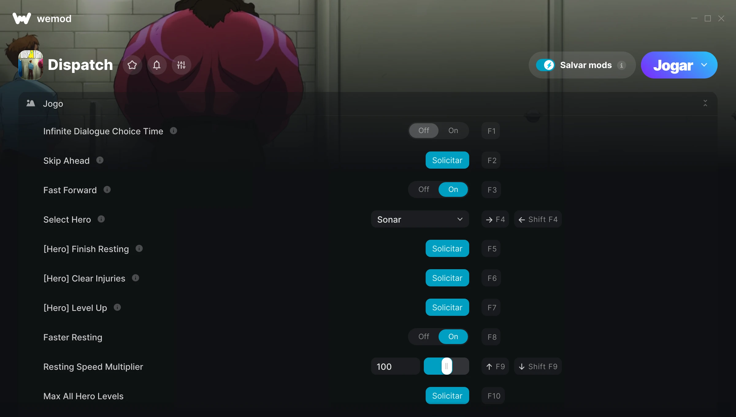 Como uso as trapaças em Dispatch?O WeMod exibirá todos os jogos no seu PC com segurança. Abra um jogo da lista e simplesmente pressione Jogar. Depois que o jogo for carregado e você estiver no jogo, você poderá começar a ativar diferentes trapaças!Vai funcionar com a minha versão do jogo?O WeMod usa tecnologia avançada para detectar a versão do jogo que você está rodando e avisar se é suportada. Se não for, você ainda terá a opção de tentar assim mesmo ou solicitar uma atualização!