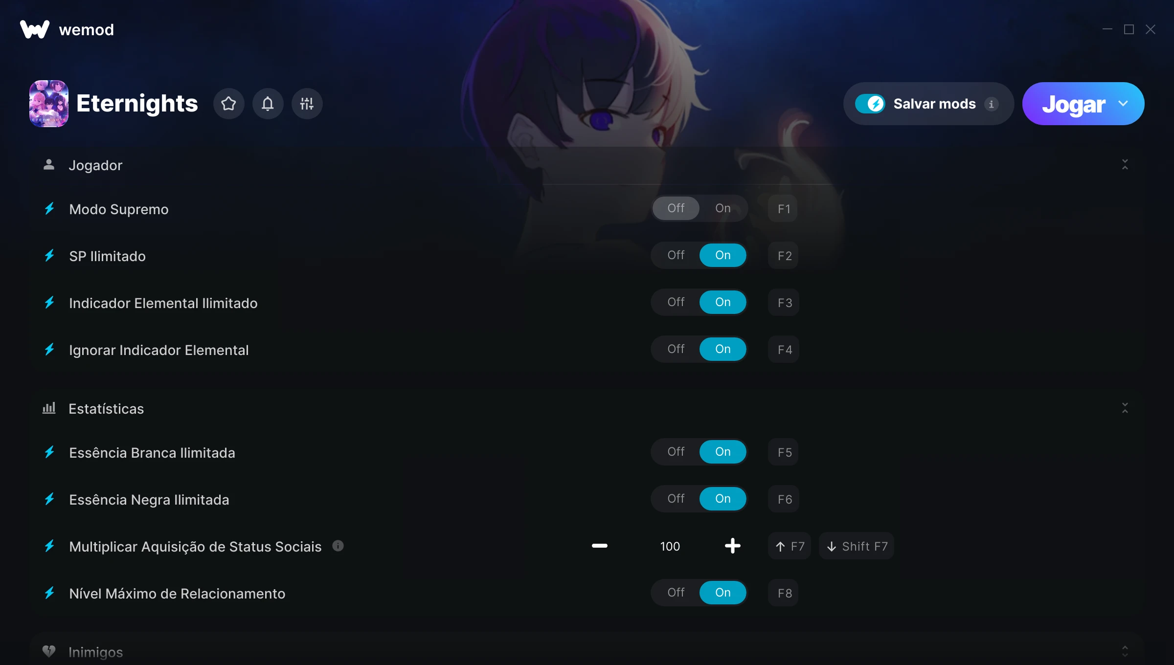 Como uso as trapaças em Eternights?O WeMod exibirá todos os jogos no seu PC com segurança. Abra um jogo da lista e simplesmente pressione Jogar. Depois que o jogo for carregado e você estiver no jogo, você poderá começar a ativar diferentes trapaças!Vai funcionar com a minha versão do jogo?O WeMod usa tecnologia avançada para detectar a versão do jogo que você está rodando e avisar se é suportada. Se não for, você ainda terá a opção de tentar assim mesmo ou solicitar uma atualização!