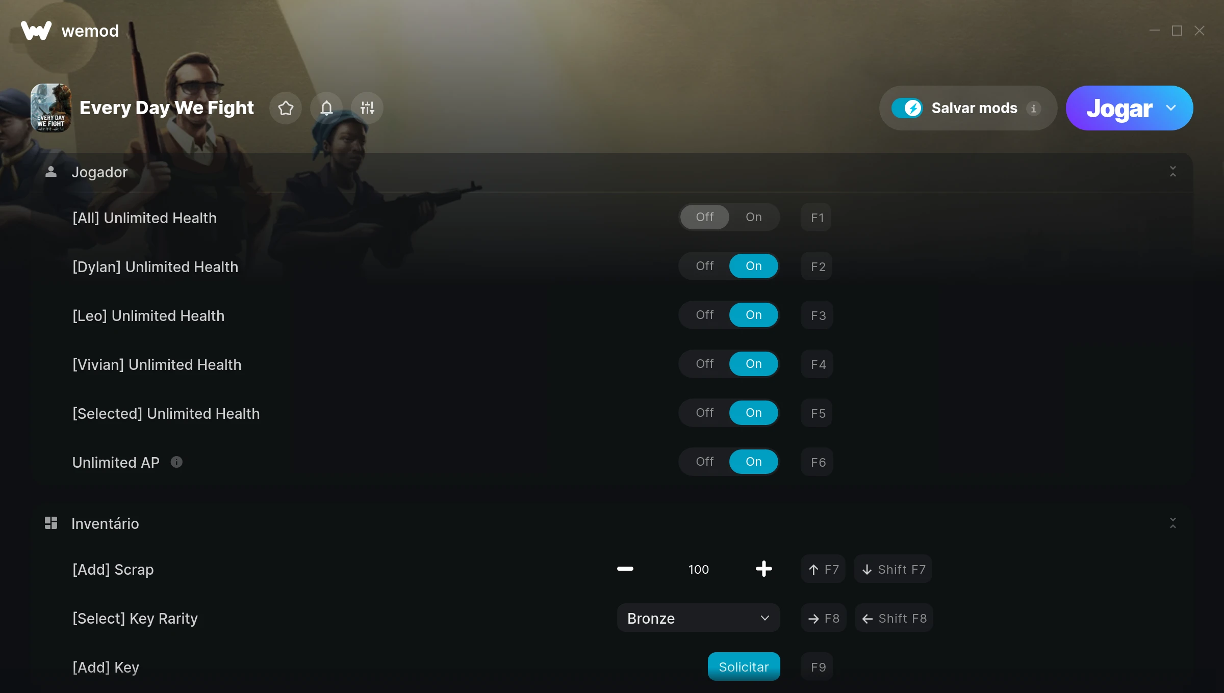 Como uso as trapaças em Every Day We Fight?O WeMod exibirá todos os jogos no seu PC com segurança. Abra um jogo da lista e simplesmente pressione Jogar. Depois que o jogo for carregado e você estiver no jogo, você poderá começar a ativar diferentes trapaças!Vai funcionar com a minha versão do jogo?O WeMod usa tecnologia avançada para detectar a versão do jogo que você está rodando e avisar se é suportada. Se não for, você ainda terá a opção de tentar assim mesmo ou solicitar uma atualização!