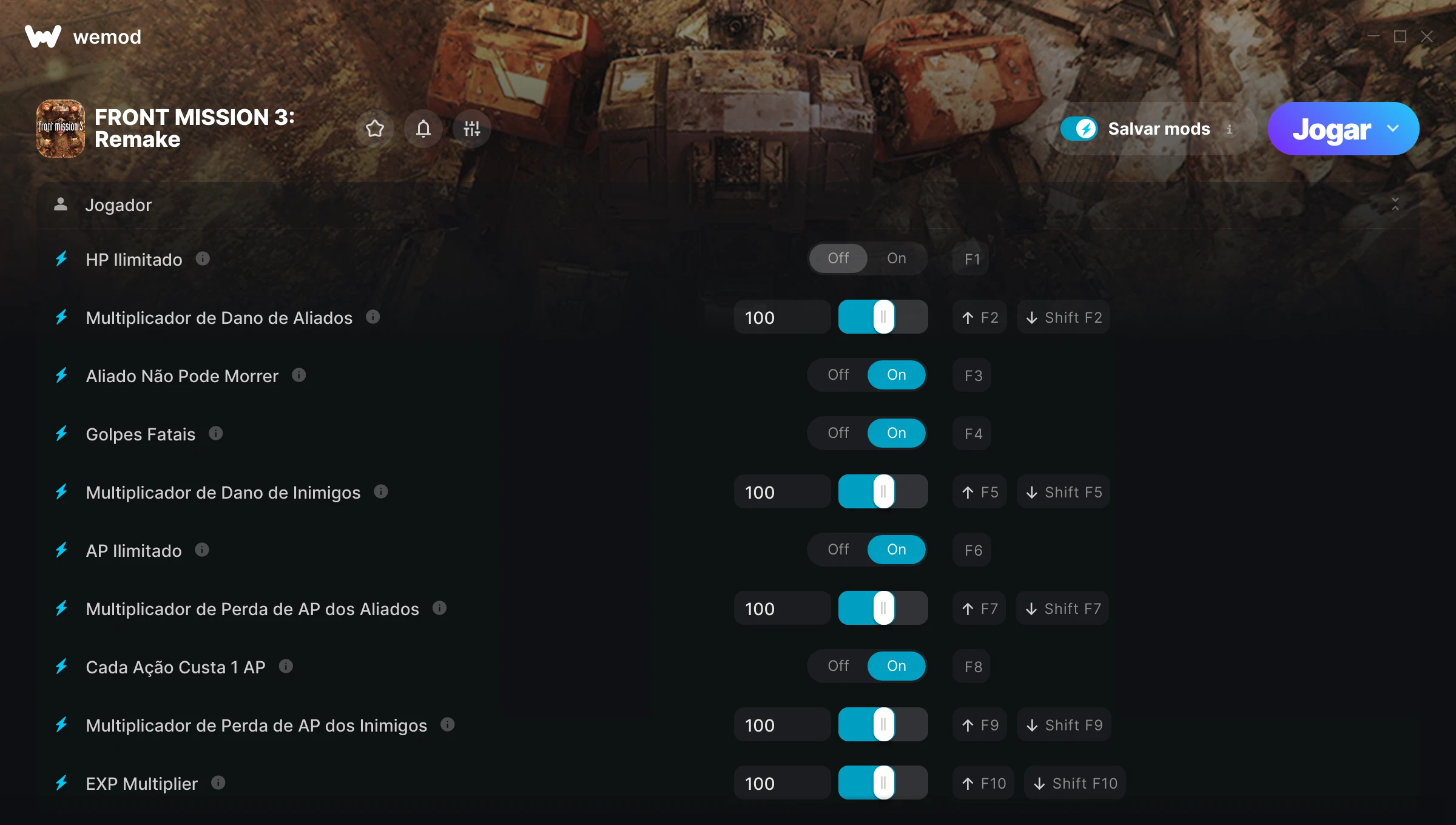 Como uso as trapaças em FRONT MISSION 3: Remake?O WeMod exibirá todos os jogos no seu PC com segurança. Abra um jogo da lista e simplesmente pressione Jogar. Depois que o jogo for carregado e você estiver no jogo, você poderá começar a ativar diferentes trapaças!Vai funcionar com a minha versão do jogo?O WeMod usa tecnologia avançada para detectar a versão do jogo que você está rodando e avisar se é suportada. Se não for, você ainda terá a opção de tentar assim mesmo ou solicitar uma atualização!