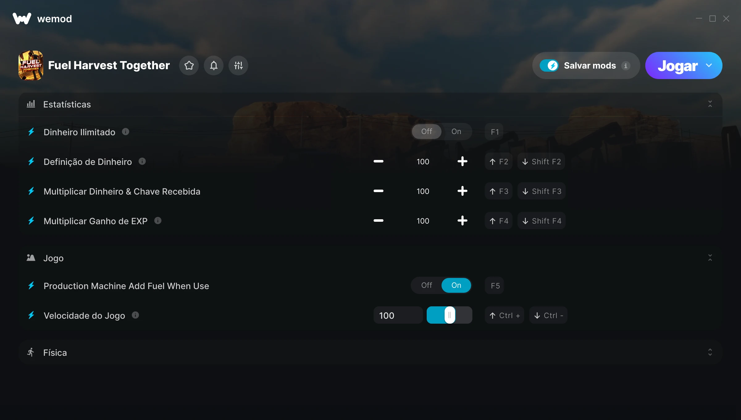 Como uso as trapaças em Fuel Harvest Together?O WeMod exibirá todos os jogos no seu PC com segurança. Abra um jogo da lista e simplesmente pressione Jogar. Depois que o jogo for carregado e você estiver no jogo, você poderá começar a ativar diferentes trapaças!Vai funcionar com a minha versão do jogo?O WeMod usa tecnologia avançada para detectar a versão do jogo que você está rodando e avisar se é suportada. Se não for, você ainda terá a opção de tentar assim mesmo ou solicitar uma atualização!