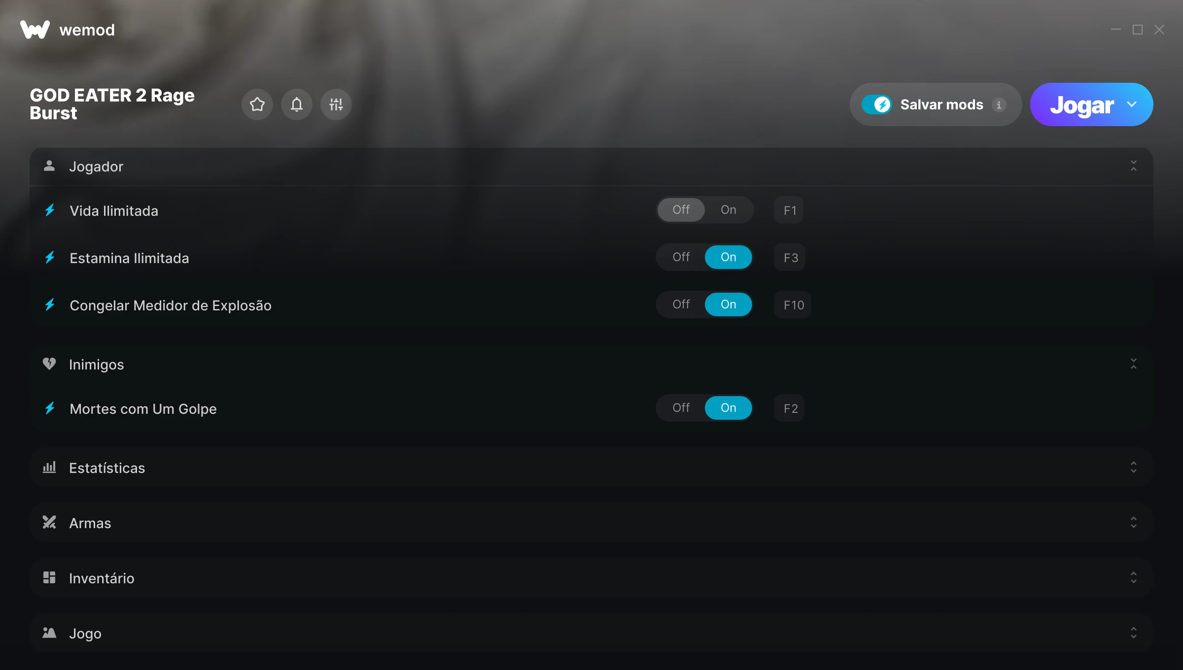 Ligada Desligada Vida ilimitada Estamina ilimitada Alternar Mods