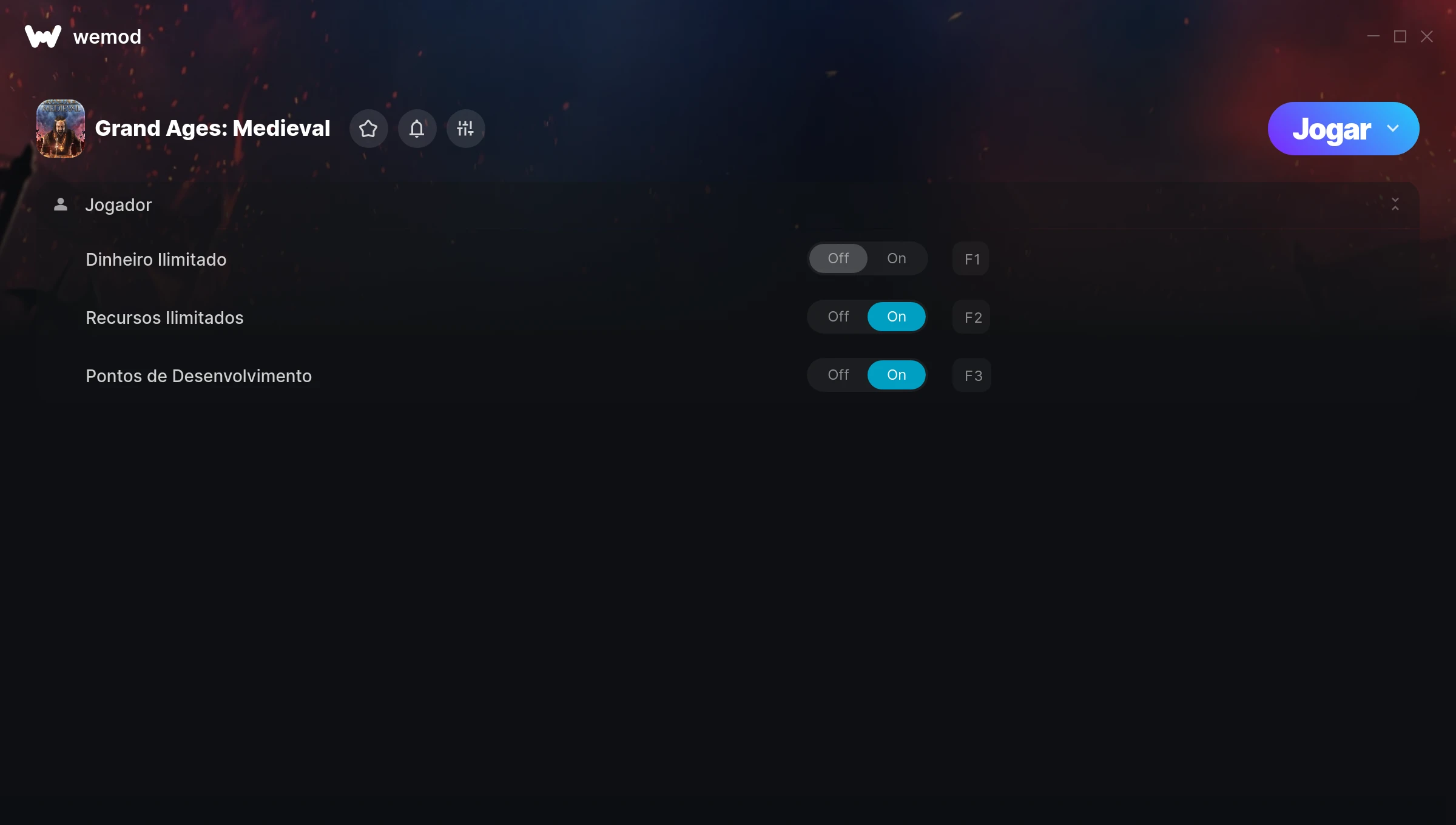 Como uso as trapaças em Grand Ages: Medieval?O WeMod exibirá todos os jogos no seu PC com segurança. Abra um jogo da lista e simplesmente pressione Jogar. Depois que o jogo for carregado e você estiver no jogo, você poderá começar a ativar diferentes trapaças!Vai funcionar com a minha versão do jogo?O WeMod usa tecnologia avançada para detectar a versão do jogo que você está rodando e avisar se é suportada. Se não for, você ainda terá a opção de tentar assim mesmo ou solicitar uma atualização!