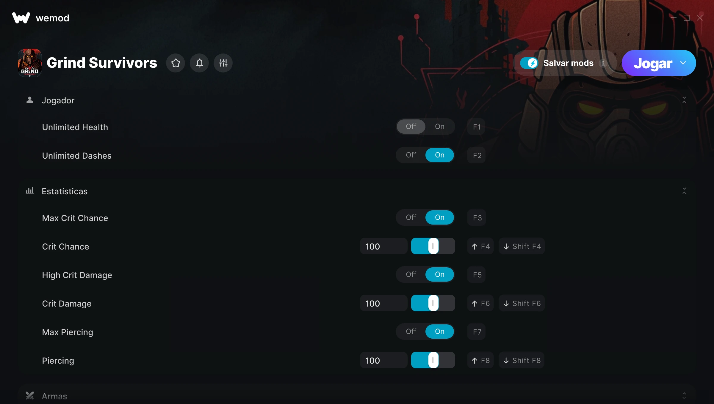 Como uso as trapaças em Grind Survivors?O WeMod exibirá todos os jogos no seu PC com segurança. Abra um jogo da lista e simplesmente pressione Jogar. Depois que o jogo for carregado e você estiver no jogo, você poderá começar a ativar diferentes trapaças!Vai funcionar com a minha versão do jogo?O WeMod usa tecnologia avançada para detectar a versão do jogo que você está rodando e avisar se é suportada. Se não for, você ainda terá a opção de tentar assim mesmo ou solicitar uma atualização!