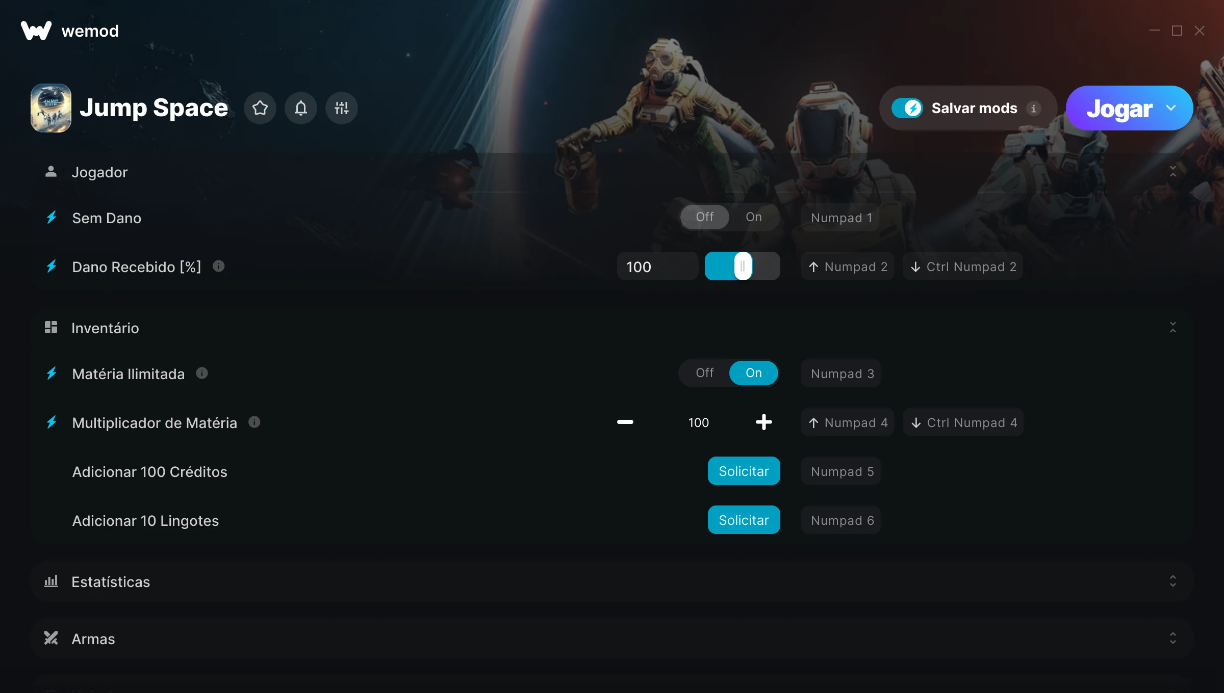 85MB Windows ...ou visite nossa página usando seu PC para baixar o aplicativo Obtenha Sem Dano, Dano Recebido [%] & 19 outros mods for Jump Space with WeMod