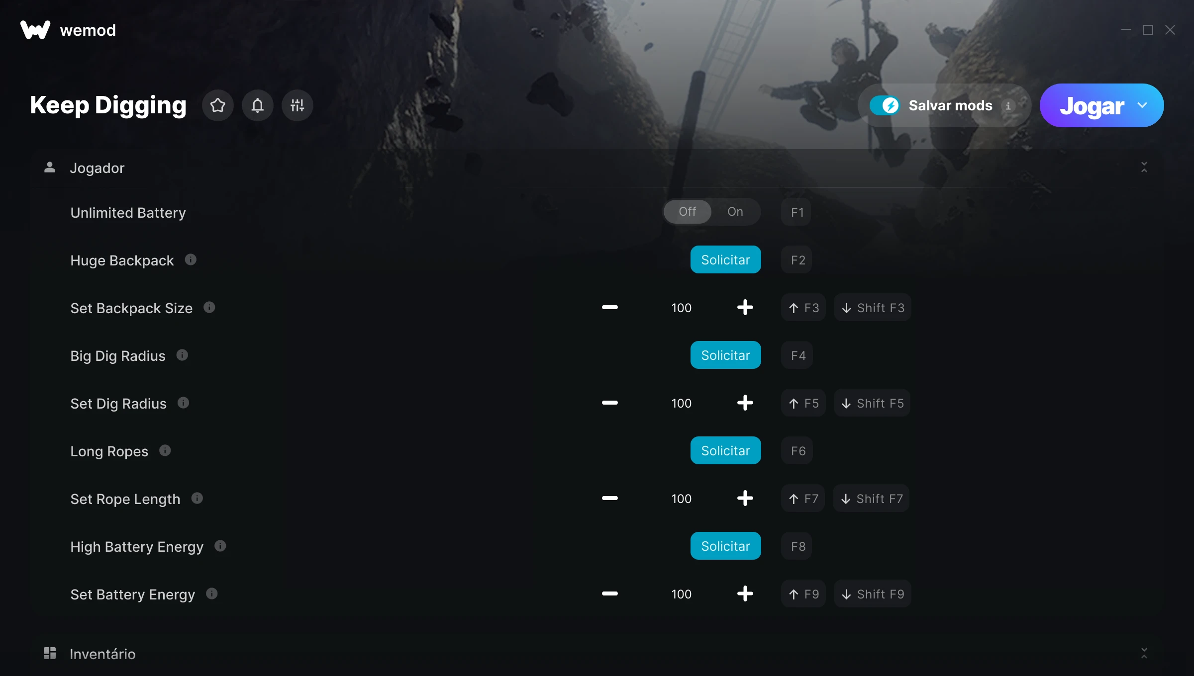 Como uso as trapaças em Keep Digging?O WeMod exibirá todos os jogos no seu PC com segurança. Abra um jogo da lista e simplesmente pressione Jogar. Depois que o jogo for carregado e você estiver no jogo, você poderá começar a ativar diferentes trapaças!Vai funcionar com a minha versão do jogo?O WeMod usa tecnologia avançada para detectar a versão do jogo que você está rodando e avisar se é suportada. Se não for, você ainda terá a opção de tentar assim mesmo ou solicitar uma atualização!