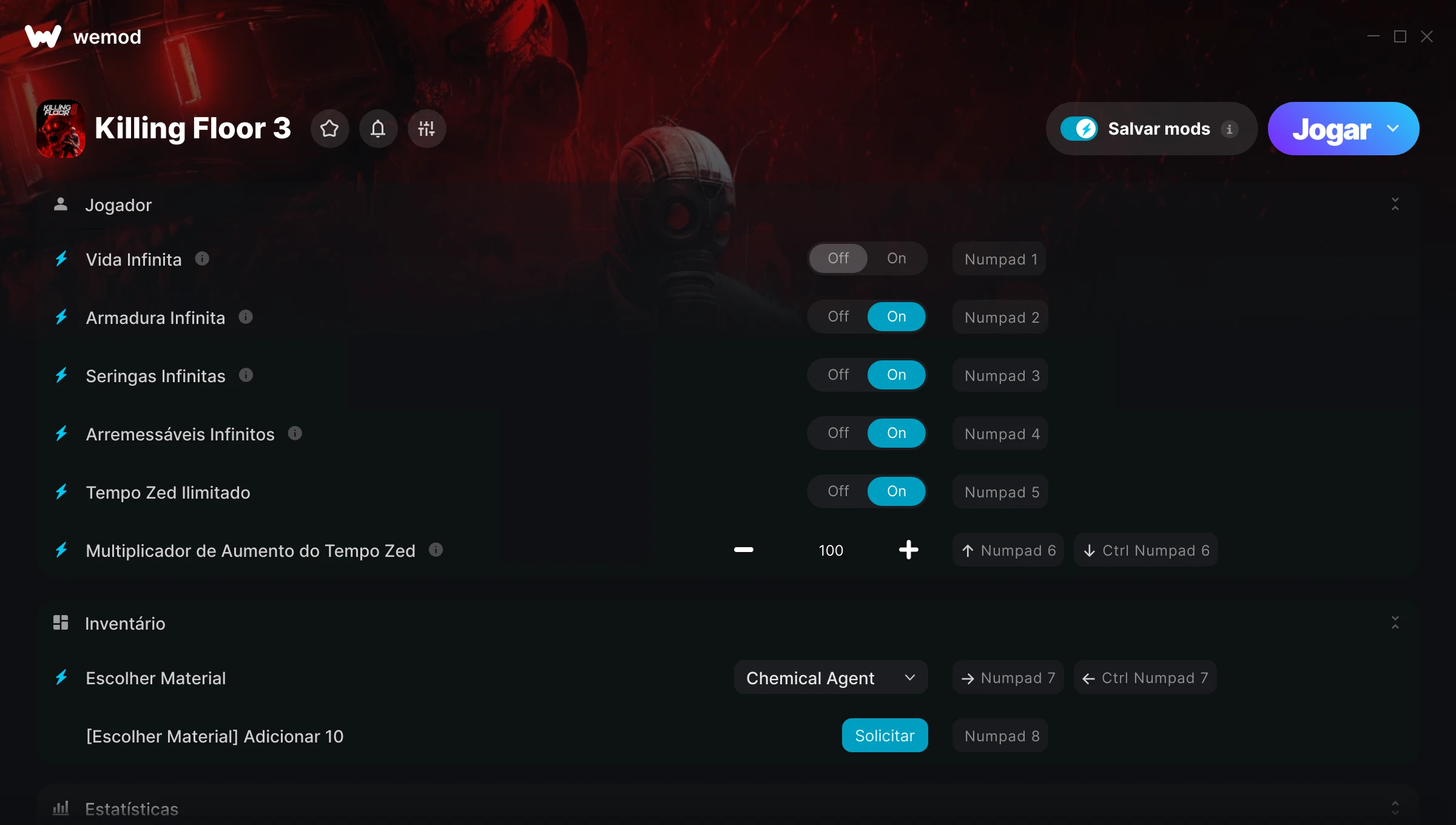 Ligada Desligada Vida ilimitada Estamina ilimitada Alternar Mods