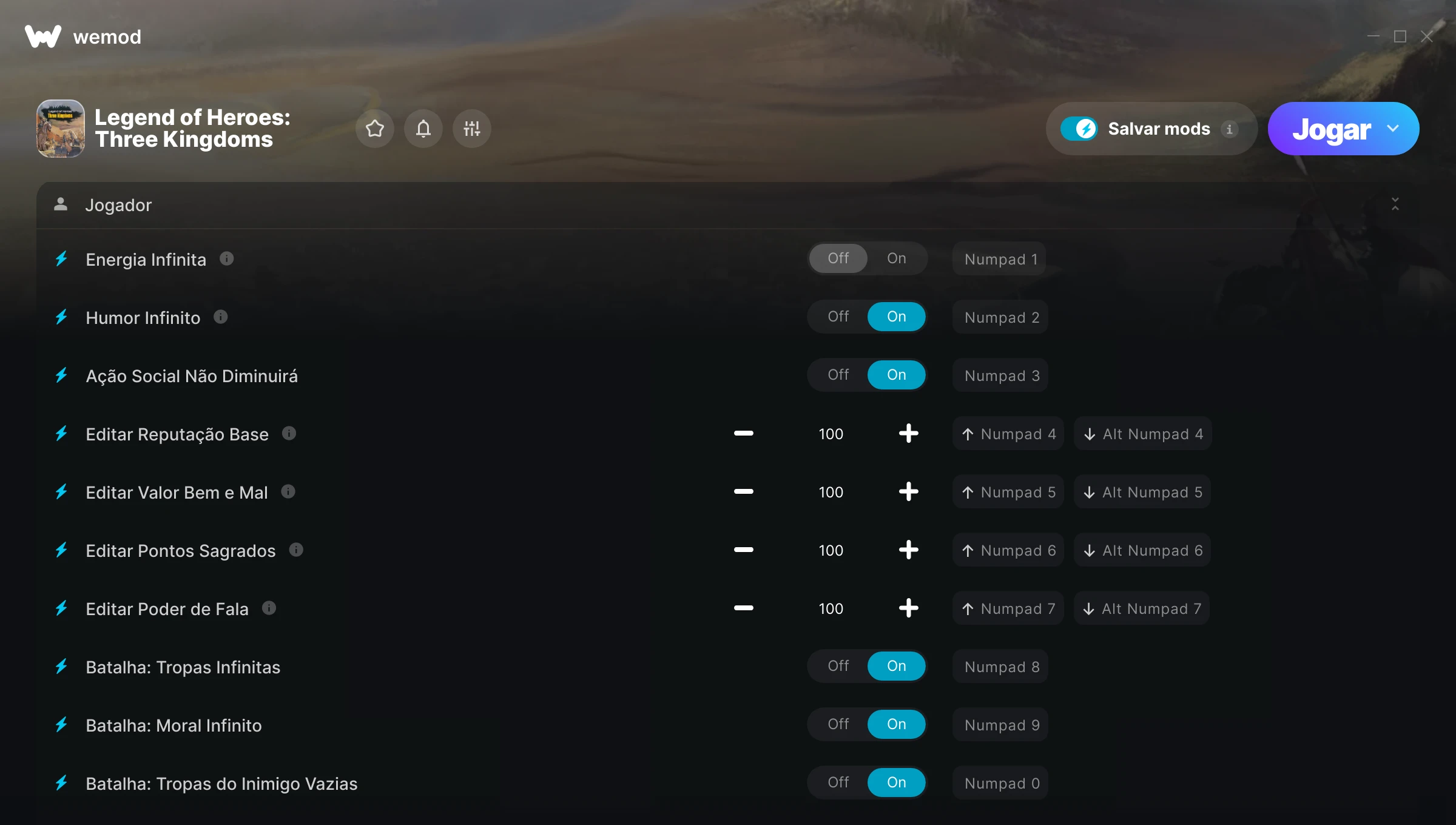 Como uso as trapaças em Legend of Heroes: Three Kingdoms?O WeMod exibirá todos os jogos no seu PC com segurança. Abra um jogo da lista e simplesmente pressione Jogar. Depois que o jogo for carregado e você estiver no jogo, você poderá começar a ativar diferentes trapaças!Vai funcionar com a minha versão do jogo?O WeMod usa tecnologia avançada para detectar a versão do jogo que você está rodando e avisar se é suportada. Se não for, você ainda terá a opção de tentar assim mesmo ou solicitar uma atualização!
