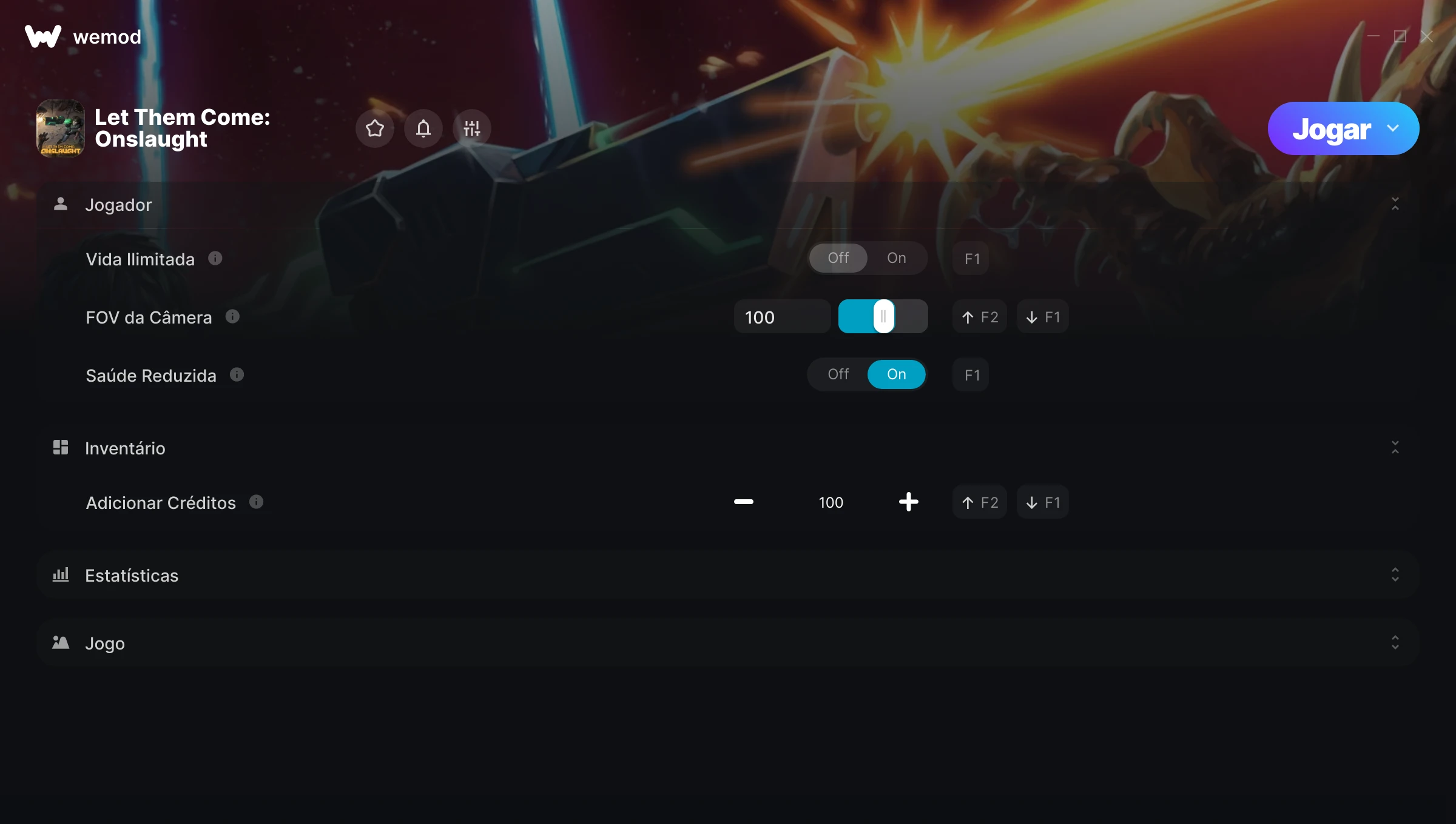 Como uso as trapaças em Let Them Come: Onslaught?O WeMod exibirá todos os jogos no seu PC com segurança. Abra um jogo da lista e simplesmente pressione Jogar. Depois que o jogo for carregado e você estiver no jogo, você poderá começar a ativar diferentes trapaças!Vai funcionar com a minha versão do jogo?O WeMod usa tecnologia avançada para detectar a versão do jogo que você está rodando e avisar se é suportada. Se não for, você ainda terá a opção de tentar assim mesmo ou solicitar uma atualização!