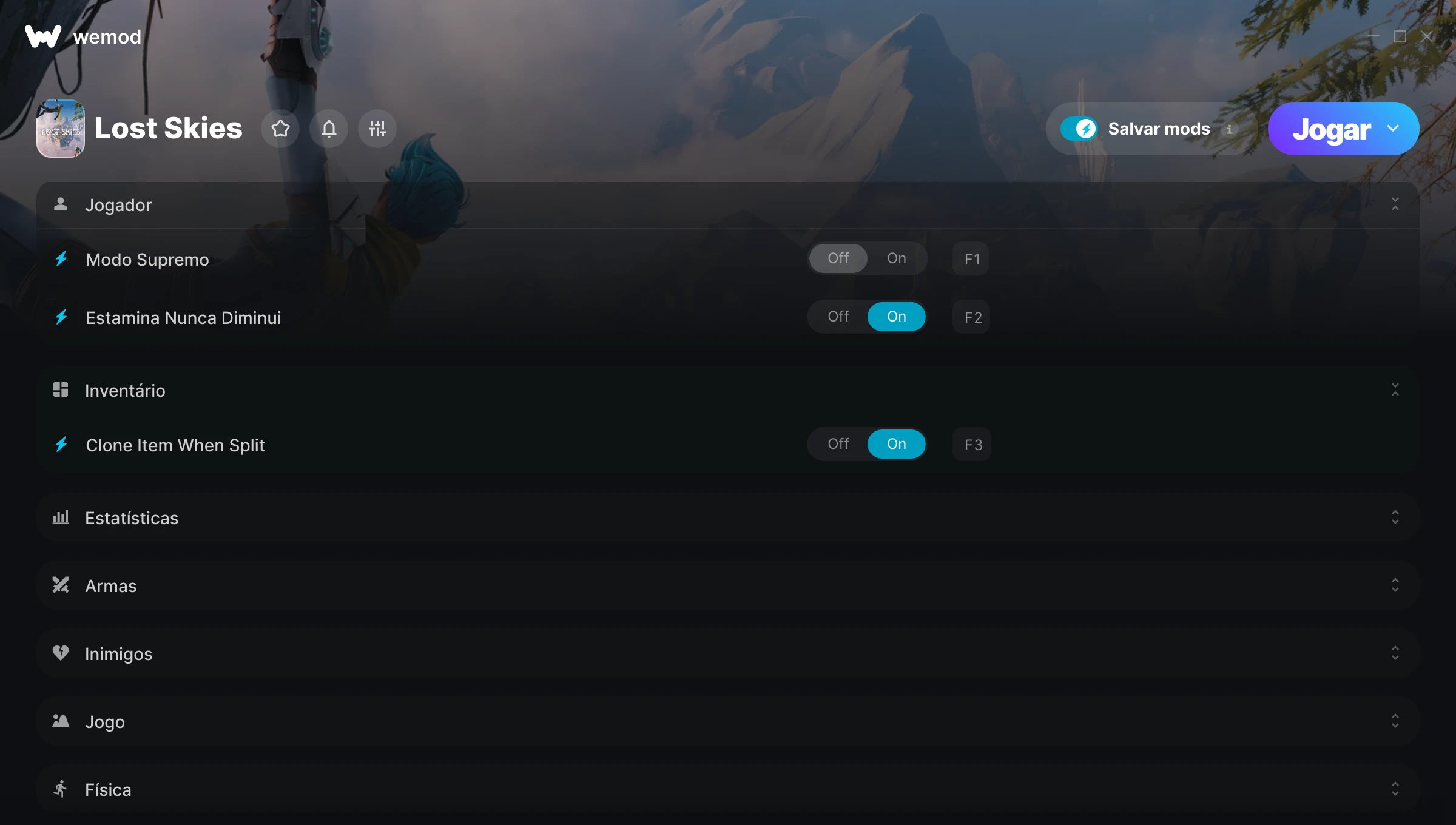 Como uso as trapaças em Lost Skies?O WeMod exibirá todos os jogos no seu PC com segurança. Abra um jogo da lista e simplesmente pressione Jogar. Depois que o jogo for carregado e você estiver no jogo, você poderá começar a ativar diferentes trapaças!Vai funcionar com a minha versão do jogo?O WeMod usa tecnologia avançada para detectar a versão do jogo que você está rodando e avisar se é suportada. Se não for, você ainda terá a opção de tentar assim mesmo ou solicitar uma atualização!
