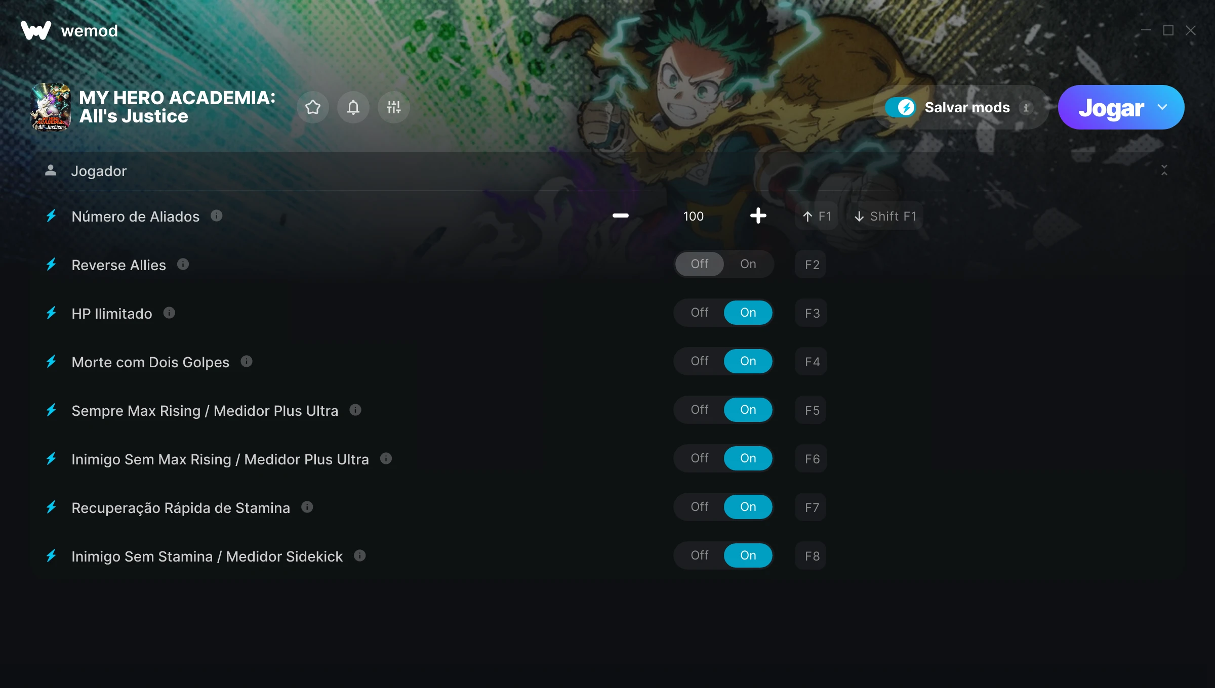 Como uso as trapaças em MY HERO ACADEMIA: All's Justice?O WeMod exibirá todos os jogos no seu PC com segurança. Abra um jogo da lista e simplesmente pressione Jogar. Depois que o jogo for carregado e você estiver no jogo, você poderá começar a ativar diferentes trapaças!Vai funcionar com a minha versão do jogo?O WeMod usa tecnologia avançada para detectar a versão do jogo que você está rodando e avisar se é suportada. Se não for, você ainda terá a opção de tentar assim mesmo ou solicitar uma atualização!