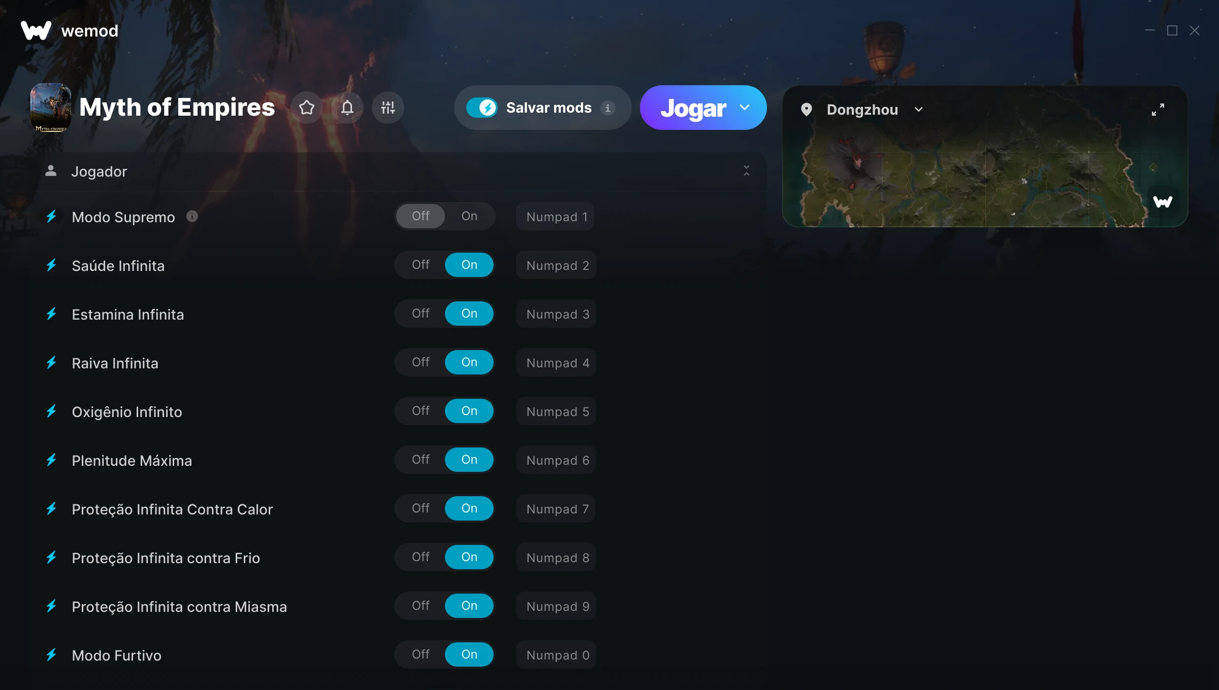 Como uso as trapaças em Myth of Empires?O WeMod exibirá todos os jogos no seu PC com segurança. Abra um jogo da lista e simplesmente pressione Jogar. Depois que o jogo for carregado e você estiver no jogo, você poderá começar a ativar diferentes trapaças!Vai funcionar com a minha versão do jogo?O WeMod usa tecnologia avançada para detectar a versão do jogo que você está rodando e avisar se é suportada. Se não for, você ainda terá a opção de tentar assim mesmo ou solicitar uma atualização!