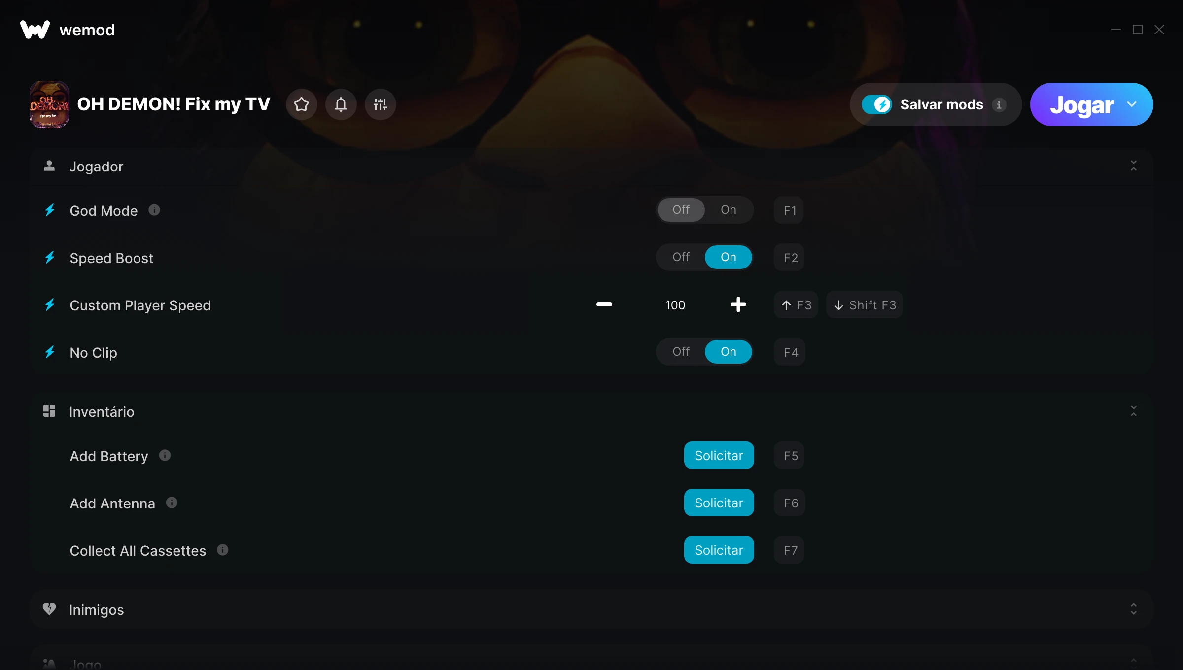 Como uso as trapaças em OH DEMON! Fix my TV?O WeMod exibirá todos os jogos no seu PC com segurança. Abra um jogo da lista e simplesmente pressione Jogar. Depois que o jogo for carregado e você estiver no jogo, você poderá começar a ativar diferentes trapaças!Vai funcionar com a minha versão do jogo?O WeMod usa tecnologia avançada para detectar a versão do jogo que você está rodando e avisar se é suportada. Se não for, você ainda terá a opção de tentar assim mesmo ou solicitar uma atualização!