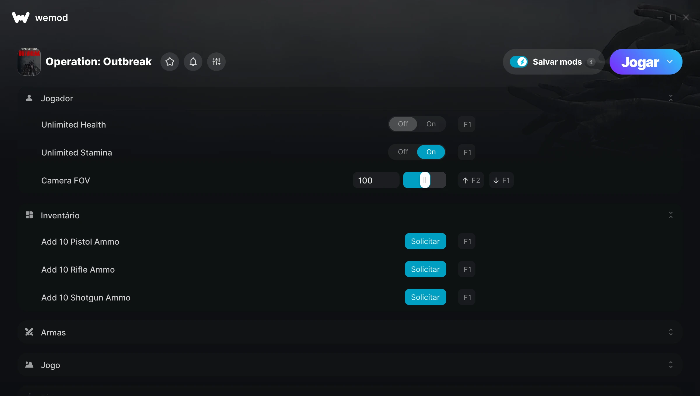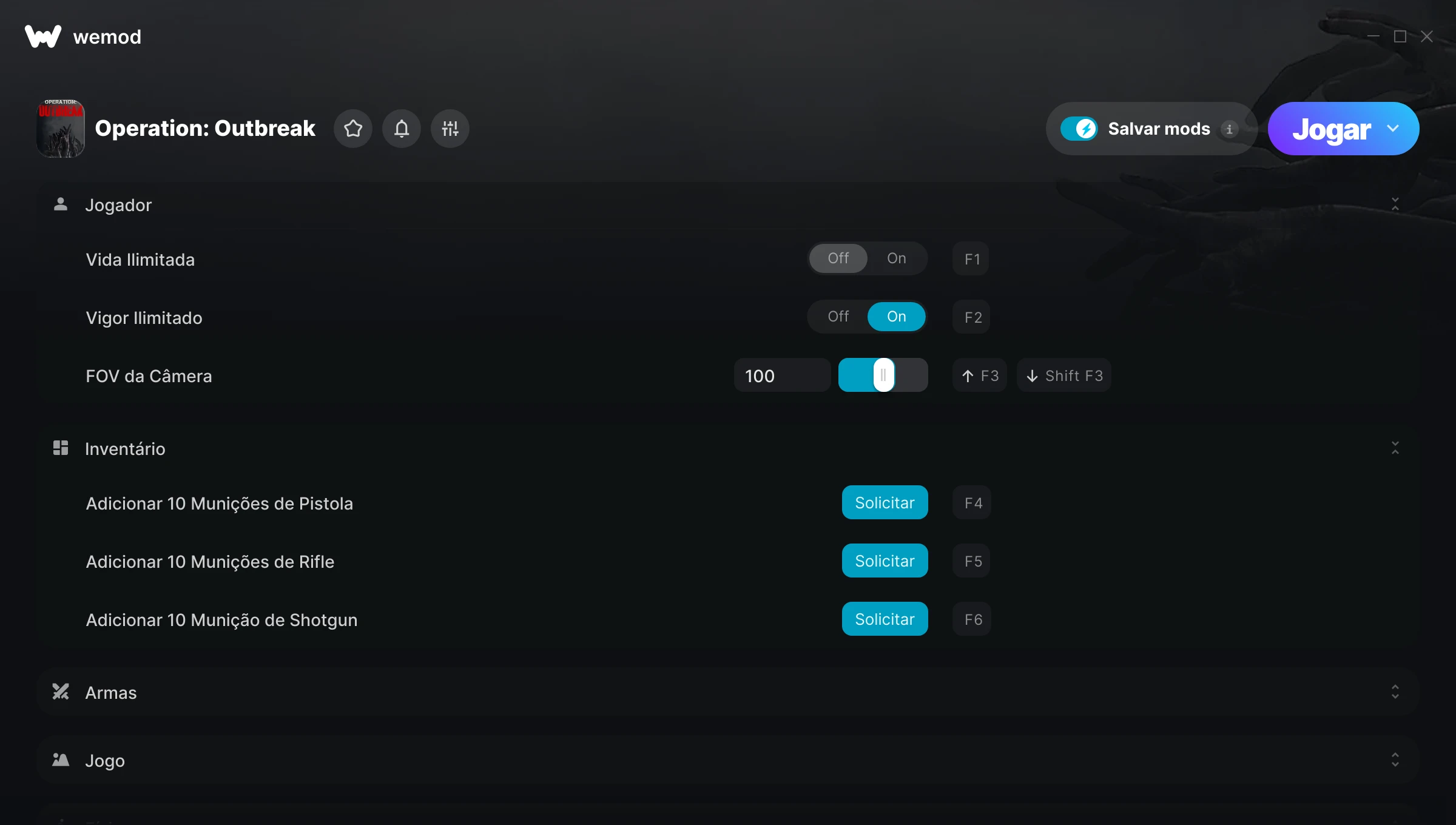 Como uso as trapaças em Operation: Outbreak?O WeMod exibirá todos os jogos no seu PC com segurança. Abra um jogo da lista e simplesmente pressione Jogar. Depois que o jogo for carregado e você estiver no jogo, você poderá começar a ativar diferentes trapaças!Vai funcionar com a minha versão do jogo?O WeMod usa tecnologia avançada para detectar a versão do jogo que você está rodando e avisar se é suportada. Se não for, você ainda terá a opção de tentar assim mesmo ou solicitar uma atualização!