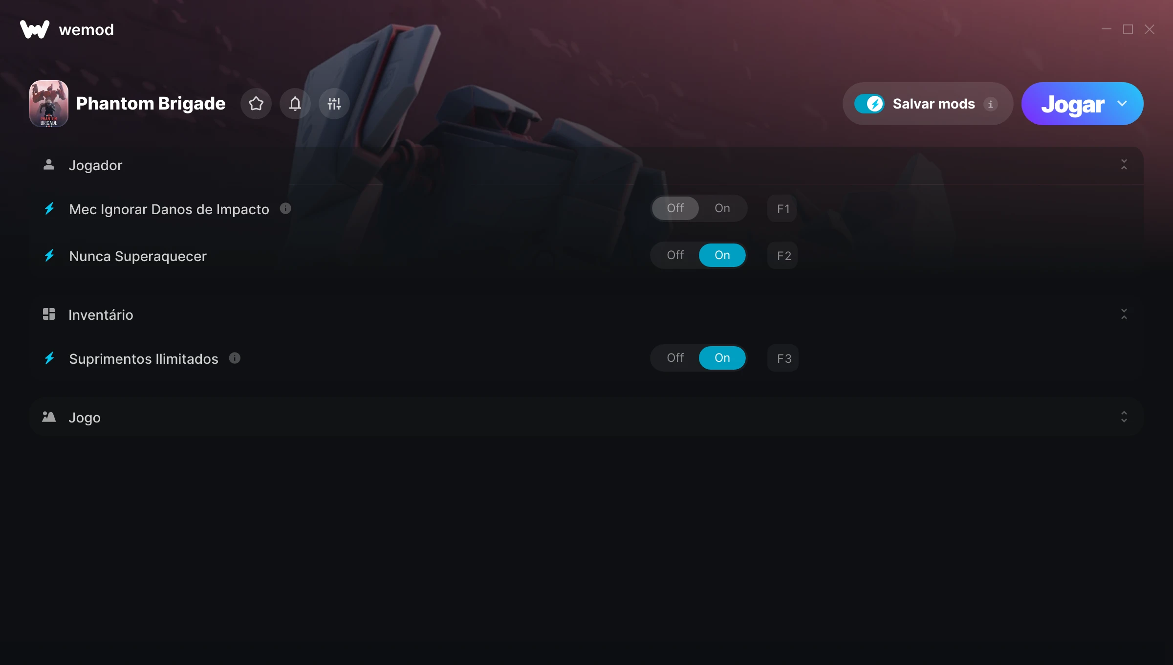 Como uso as trapaças em Phantom Brigade?O WeMod exibirá todos os jogos no seu PC com segurança. Abra um jogo da lista e simplesmente pressione Jogar. Depois que o jogo for carregado e você estiver no jogo, você poderá começar a ativar diferentes trapaças!Vai funcionar com a minha versão do jogo?O WeMod usa tecnologia avançada para detectar a versão do jogo que você está rodando e avisar se é suportada. Se não for, você ainda terá a opção de tentar assim mesmo ou solicitar uma atualização!
