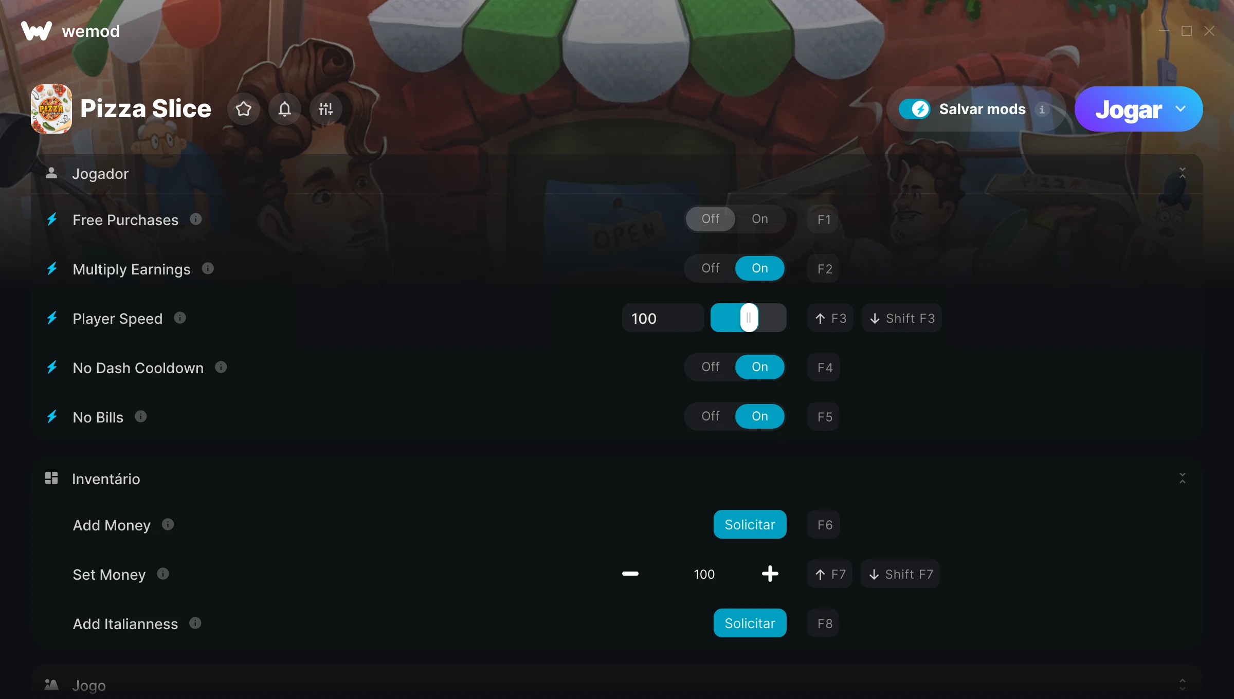Como uso as trapaças em Pizza Slice?O WeMod exibirá todos os jogos no seu PC com segurança. Abra um jogo da lista e simplesmente pressione Jogar. Depois que o jogo for carregado e você estiver no jogo, você poderá começar a ativar diferentes trapaças!Vai funcionar com a minha versão do jogo?O WeMod usa tecnologia avançada para detectar a versão do jogo que você está rodando e avisar se é suportada. Se não for, você ainda terá a opção de tentar assim mesmo ou solicitar uma atualização!
