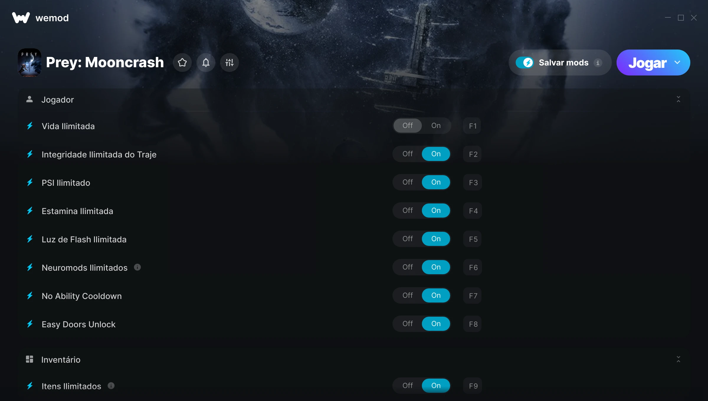 Como uso as trapaças em Prey: Mooncrash?O WeMod exibirá todos os jogos no seu PC com segurança. Abra um jogo da lista e simplesmente pressione Jogar. Depois que o jogo for carregado e você estiver no jogo, você poderá começar a ativar diferentes trapaças!Vai funcionar com a minha versão do jogo?O WeMod usa tecnologia avançada para detectar a versão do jogo que você está rodando e avisar se é suportada. Se não for, você ainda terá a opção de tentar assim mesmo ou solicitar uma atualização!